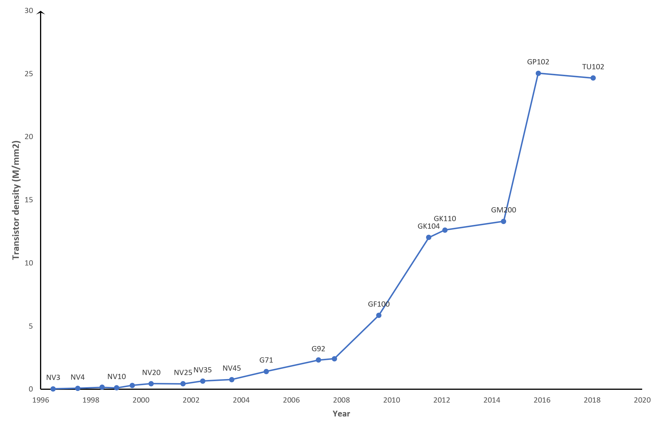 Un graphique des principaux GPU de Nvidia montrant les changements de densité de transistor au fil des ans