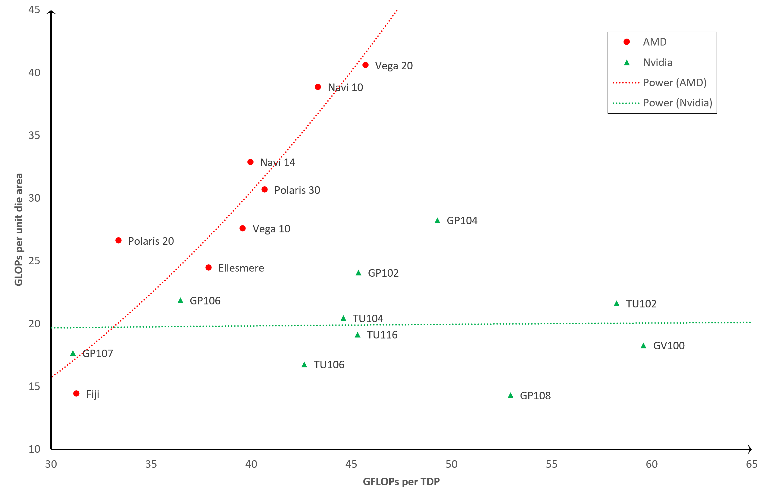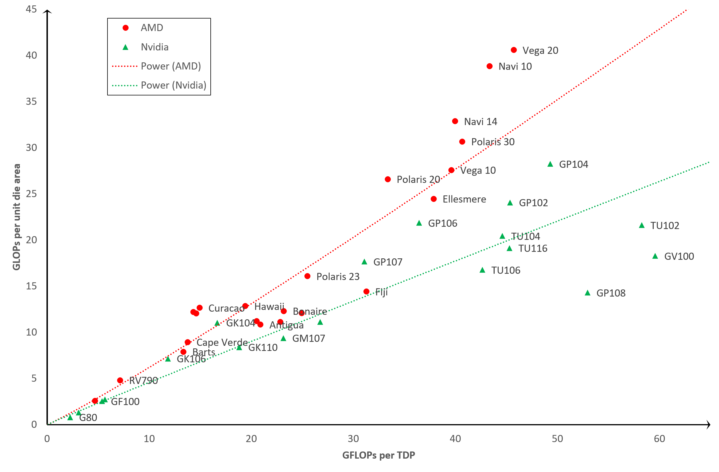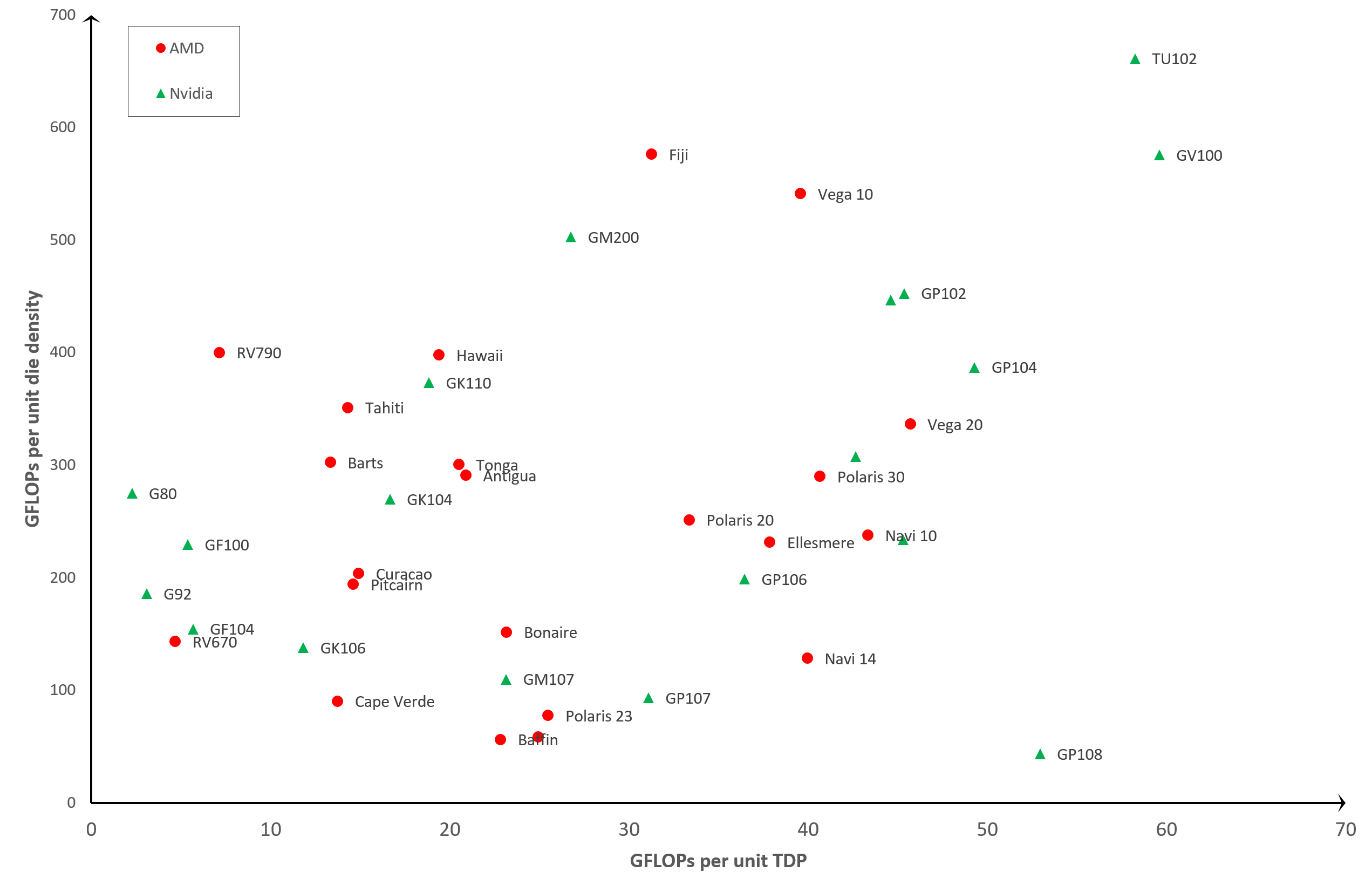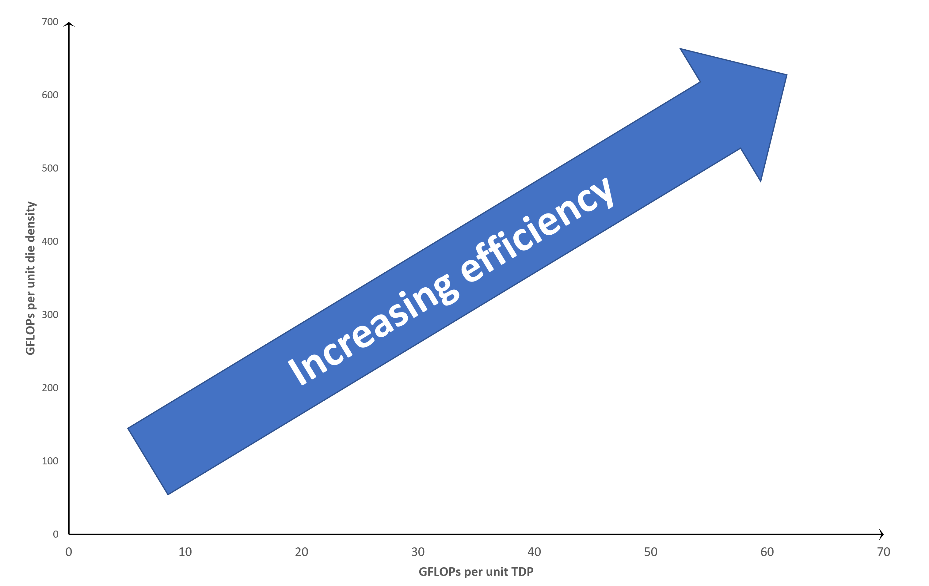 le X-l'axe trace GFLOPS par unité TDP, vous voulez donc que ce soit aussi élevé que possible: plus la position est basse avec l'axe, moins la puce est économe en énergie. Il en va de même pour le y-axis car cela trace GFLOPS par unité de densité de matrice. Plus vous avez emballé de transistors dans un mm carré, plus vous vous attendez à des performances. Ainsi, l'efficacité globale du traitement GPU (tenant compte du nombre de transistors, de la taille des matrices et du TDP) augmente à mesure que vous vous dirigez vers le coin supérieur droit du graphique.