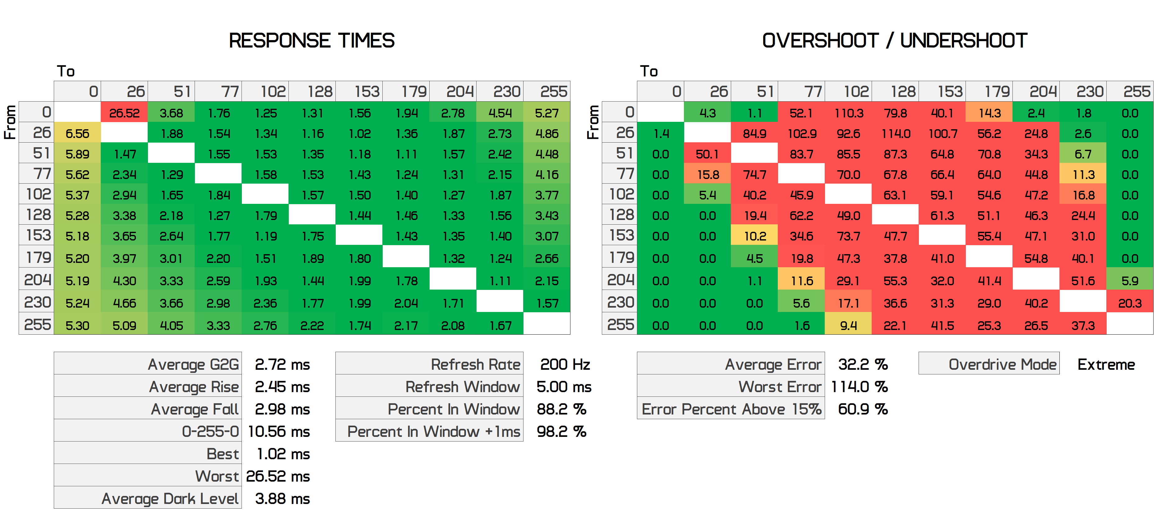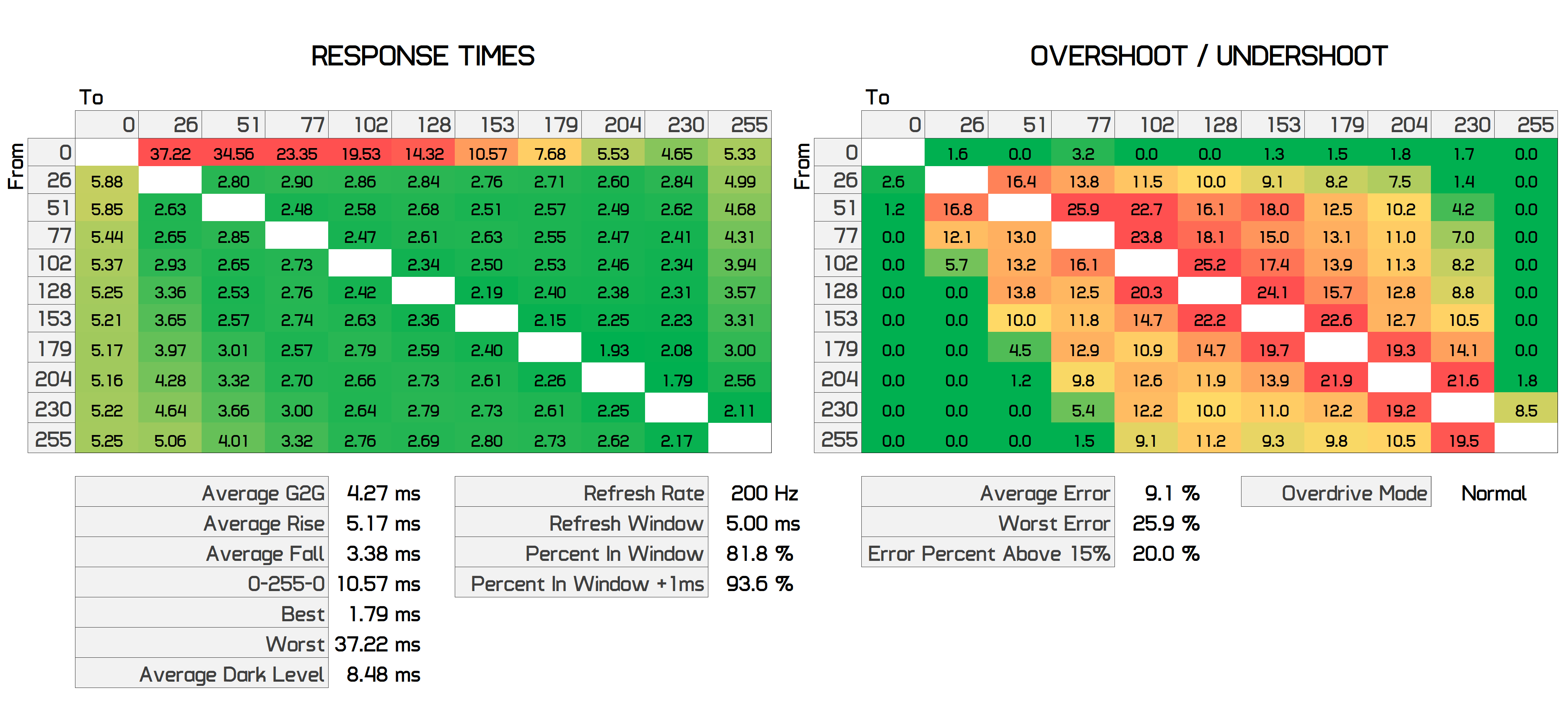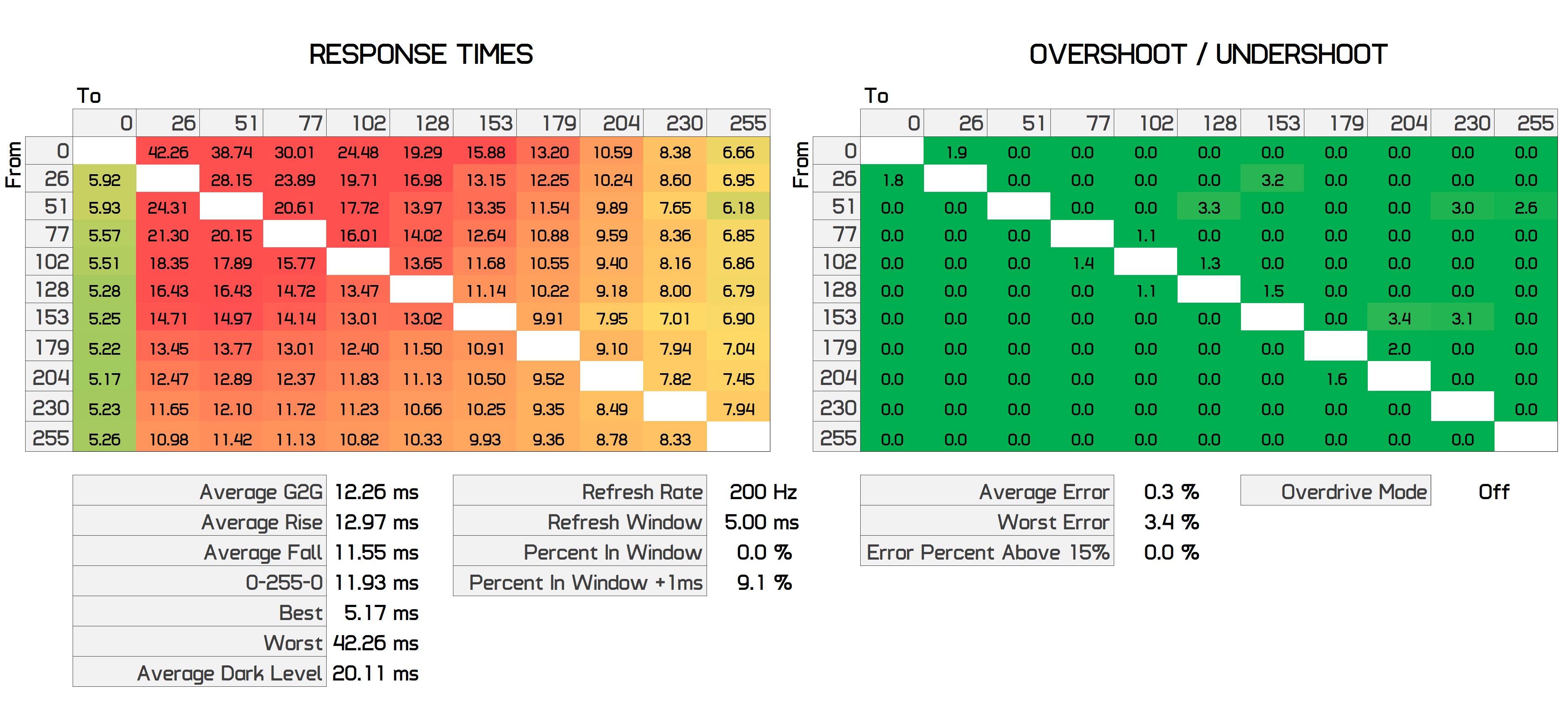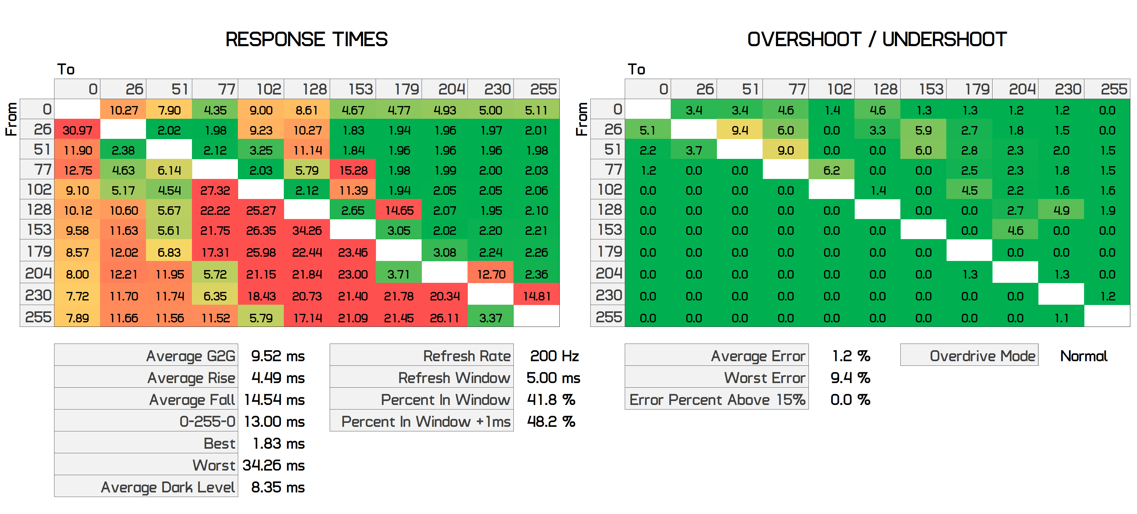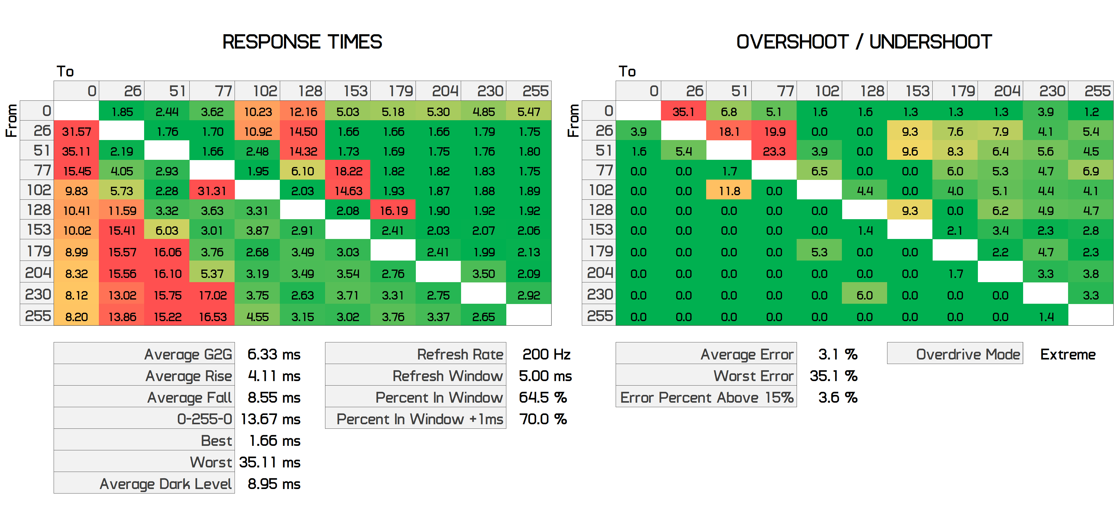 Passant aux performances, nous commencerons par examiner les temps de réponse. Le moniteur dispose de trois modes de saturation, le mode par défaut étant Normal à une fréquence de rafraîchissement maximale de 200 Hz. Quelques choses intéressantes à noter ici. Les performances de niveau d'obscurité sont vraiment bonnes pour un panneau VA. Seules les transitions de noir total souffrent de temps de réponse lents. Tout le reste est très rapide, ce qui conduit à une moyenne de niveau sombre de 8,48ms. Dans la plupart des autres VA, les transitions de gris inférieures à 40% dureront bien plus de 10 ms, mais ce que nous voyons du X35 dans ce mode s'apparente davantage à un panneau IPS, dont les performances tendent également à être médiocres lorsque le passage au noir absolu est faible.