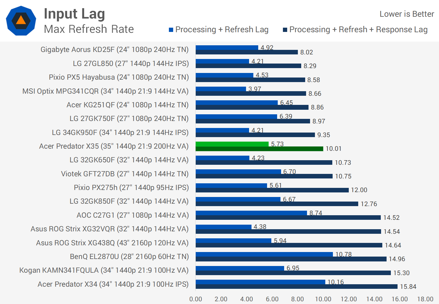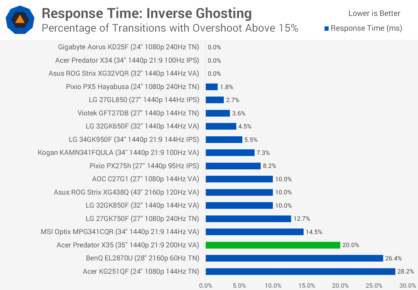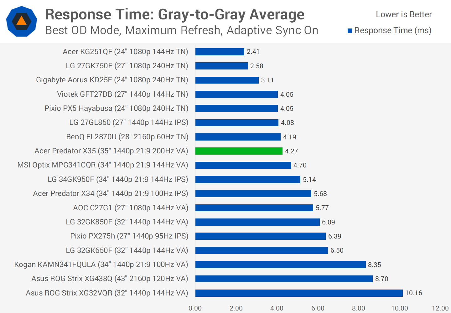 Bien que nous n’ayons pas testé le PG35VQ avec notre nouvelle suite de tests, les résultats de moyenne gris à gris entre le X35 et le PG35VQ sont très similaires dans leurs modes overdrive optimaux. Ce n'est pas une surprise, car ils utilisent tous les deux le même panneau. Mais ce que vous pouvez voir ici, c'est que le X35 fonctionne bien, en particulier pour un panneau VA en termes de temps de réponse et de conformité du taux de rafraîchissement. Cependant, encore une fois, vous pouvez voir ici que la performance d'erreur est faible.