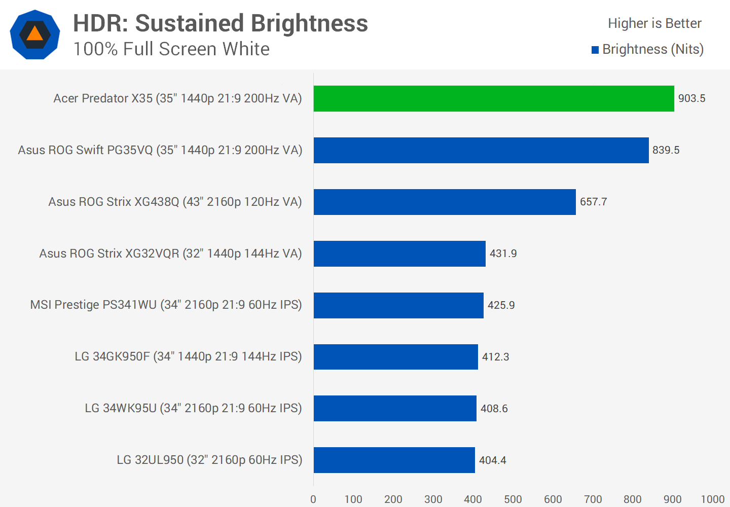 La luminosité est excellente sur ce moniteur. Il réalise plus de 900 nits maintenus dans une fenêtre entièrement blanche, qui peut atteindre 1100 nits pour une fenêtre à 10% avec une légère baisse pour les fenêtres plus petites. Les performances soutenues de ce panneau sont légèrement meilleures que celles du PG35VQ, tout comme la luminosité du flash: le X35 est capable de produire un flash blanc plein écran de 1140 nit, qui fait fondre vos yeux. Cette chose est sérieusement brillante.