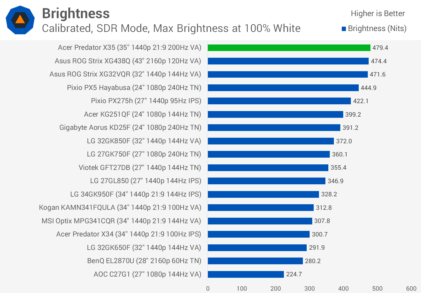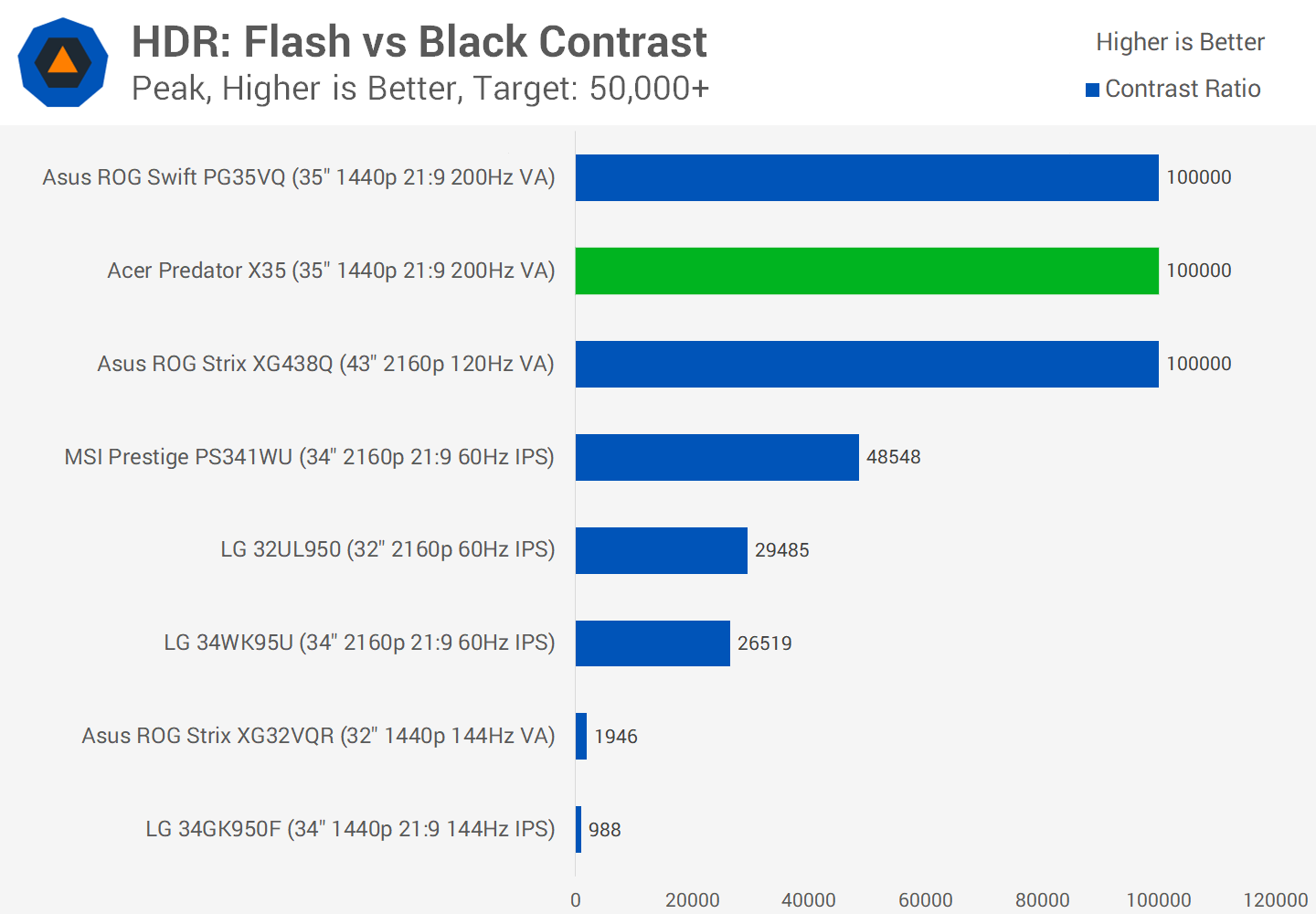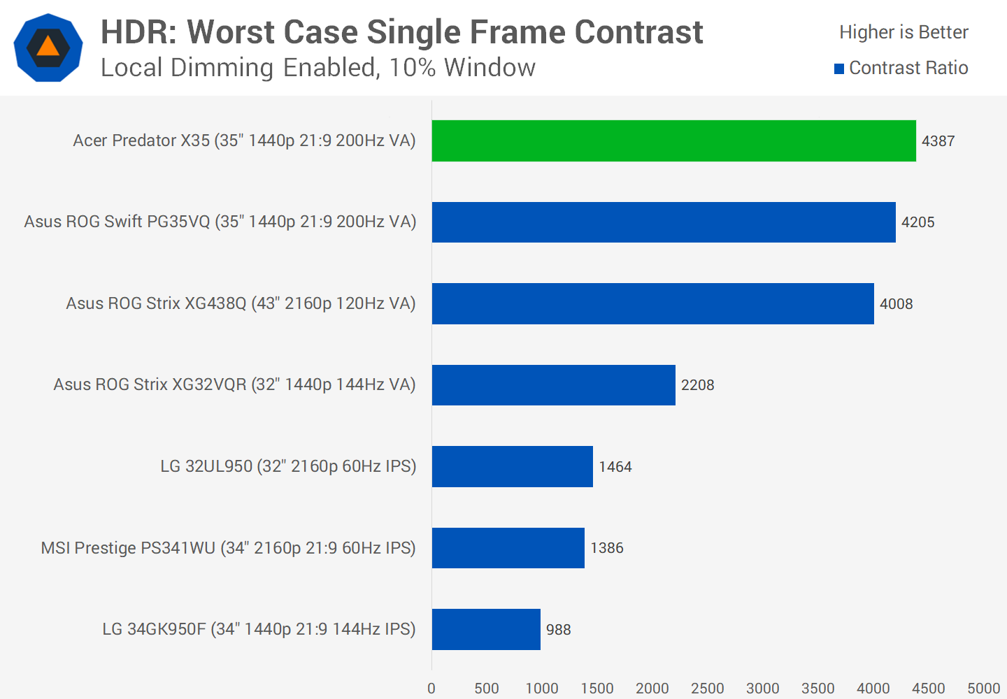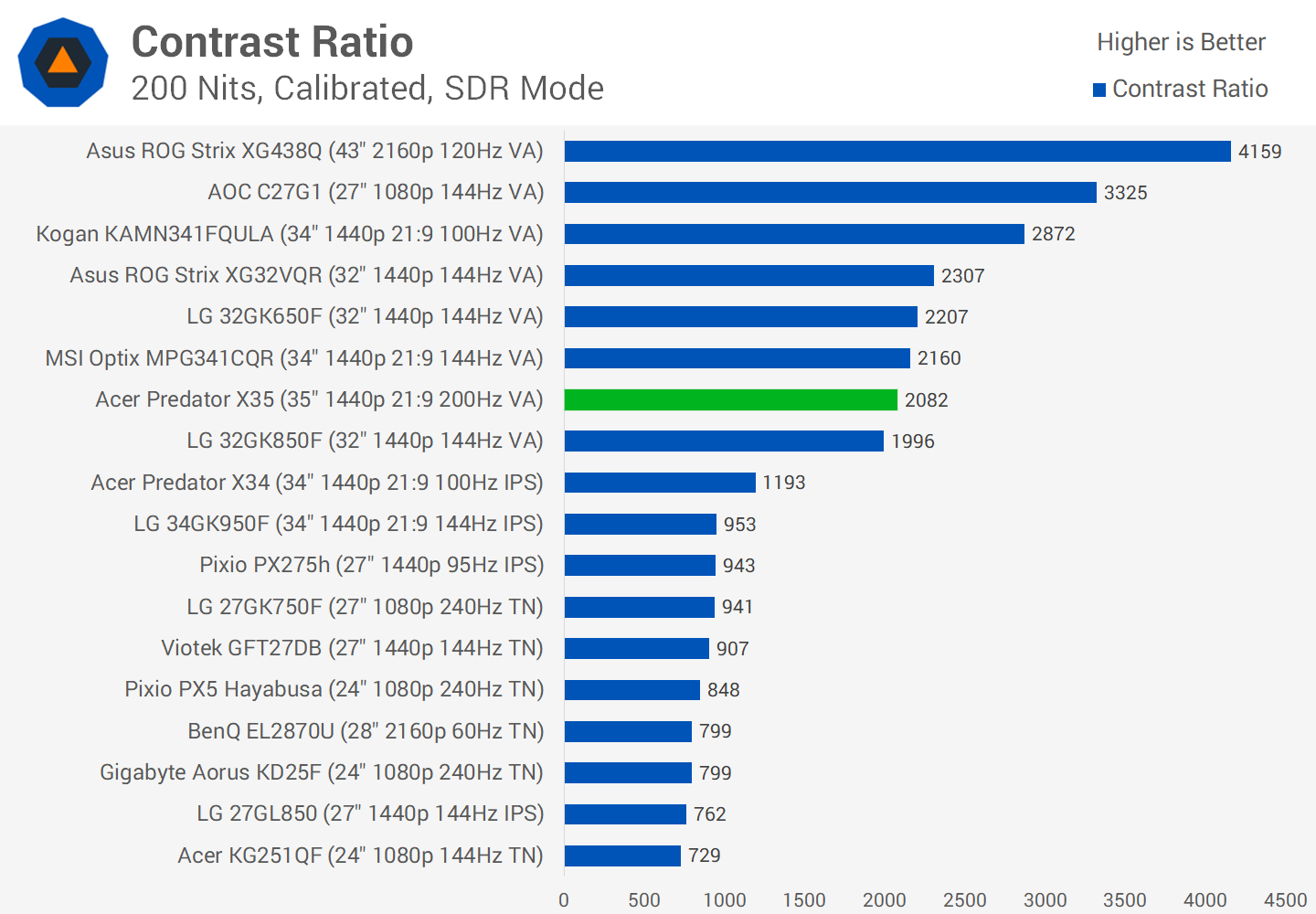 Pour la luminosité en mode SDR, nous obtenons 480 nits une fois calibrés, tout en haut des graphiques. Ceci est naturellement limité artificiellement, car le moniteur peut faire bien plus que cela en mode HDR, comme nous le verrons dans un instant. Le rapport de contraste natif est peu impressionnant à seulement 2100: 1; fondamentalement les mêmes que le PG35VQ et pas aussi haut que certains des meilleurs panneaux de VA que nous avons testés. Heureusement, nous n’obtenons pas beaucoup de perte une fois calibrés. Le rapport de contraste par défaut n’est donc pas très supérieur à ce que nous venons de montrer.