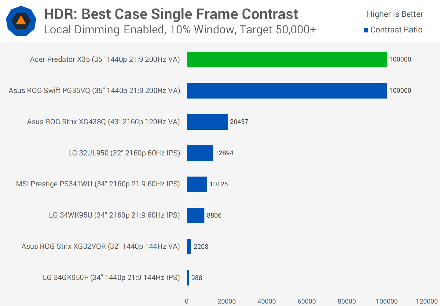 Pour le contraste multi-images, l'Acer Predator X35 se situe à la limite de nos outils de test, car le rétro-éclairage FALD désactive le rétro-éclairage complet lors de l'affichage d'un cadre entièrement noir. C’est également à la limite de notre meilleur test de contraste d’une seule image, car là encore, le rétroéclairage à atténuation locale est très efficace pour atténuer les zones sombres. C'est là que le rétro-éclairage FALD présente un avantage considérable par rapport aux panneaux semi-HDR éclairés par la périphérie, tels que le MSI PS341WU.
