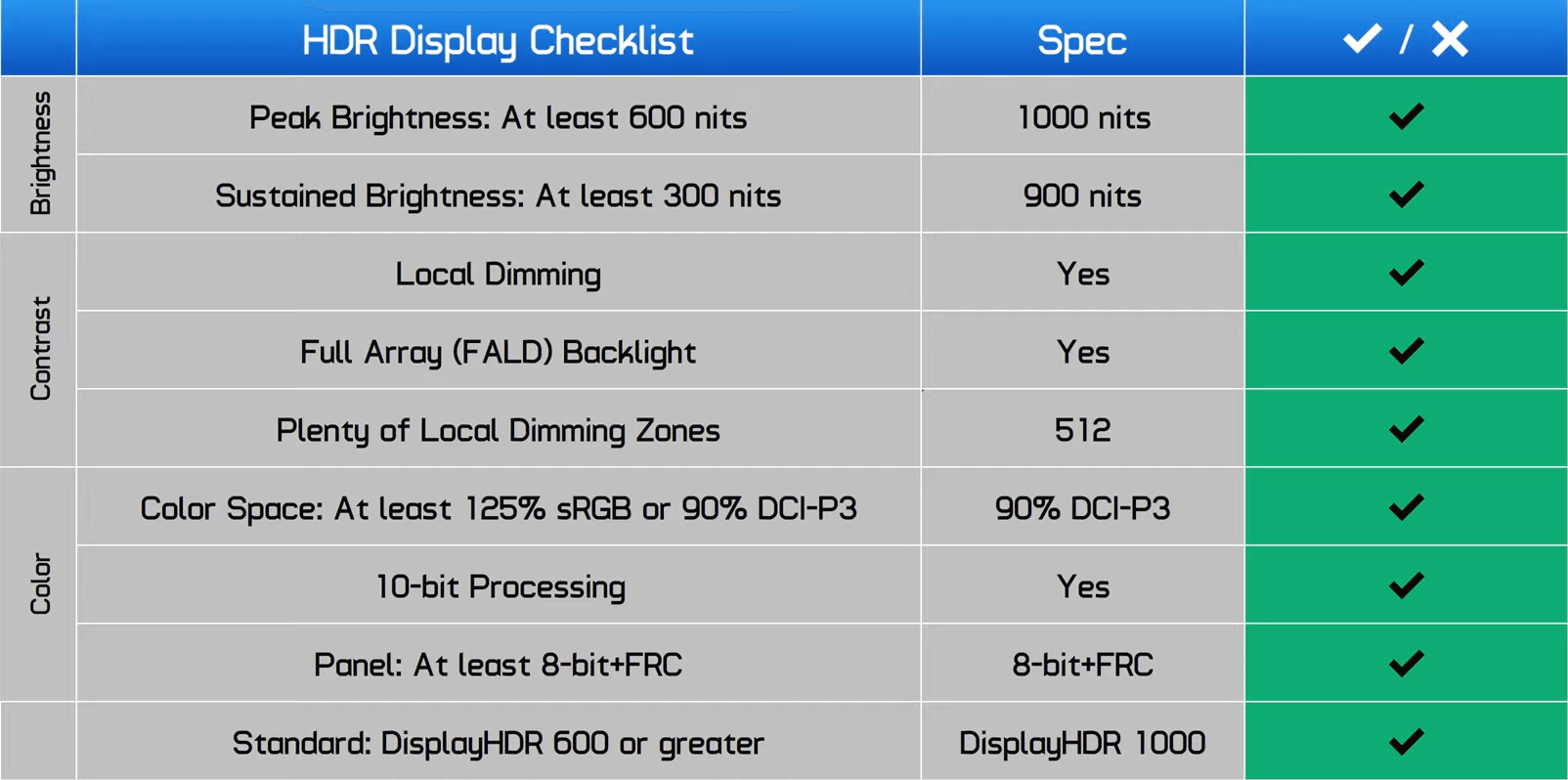 Il s’agit d’un moniteur entièrement compatible HDR, doté de la certification DisplayHDR 1000 et d’un rétroéclairage à variateur local complet offrant un nombre de zones correct. Tout ce que vous voyez dans cette liste de contrôle correspond à ce que vous payez 2 500 dollars, comparé à des moniteurs HDR plus petits qui coûtent souvent plusieurs milliers de dollars de moins.