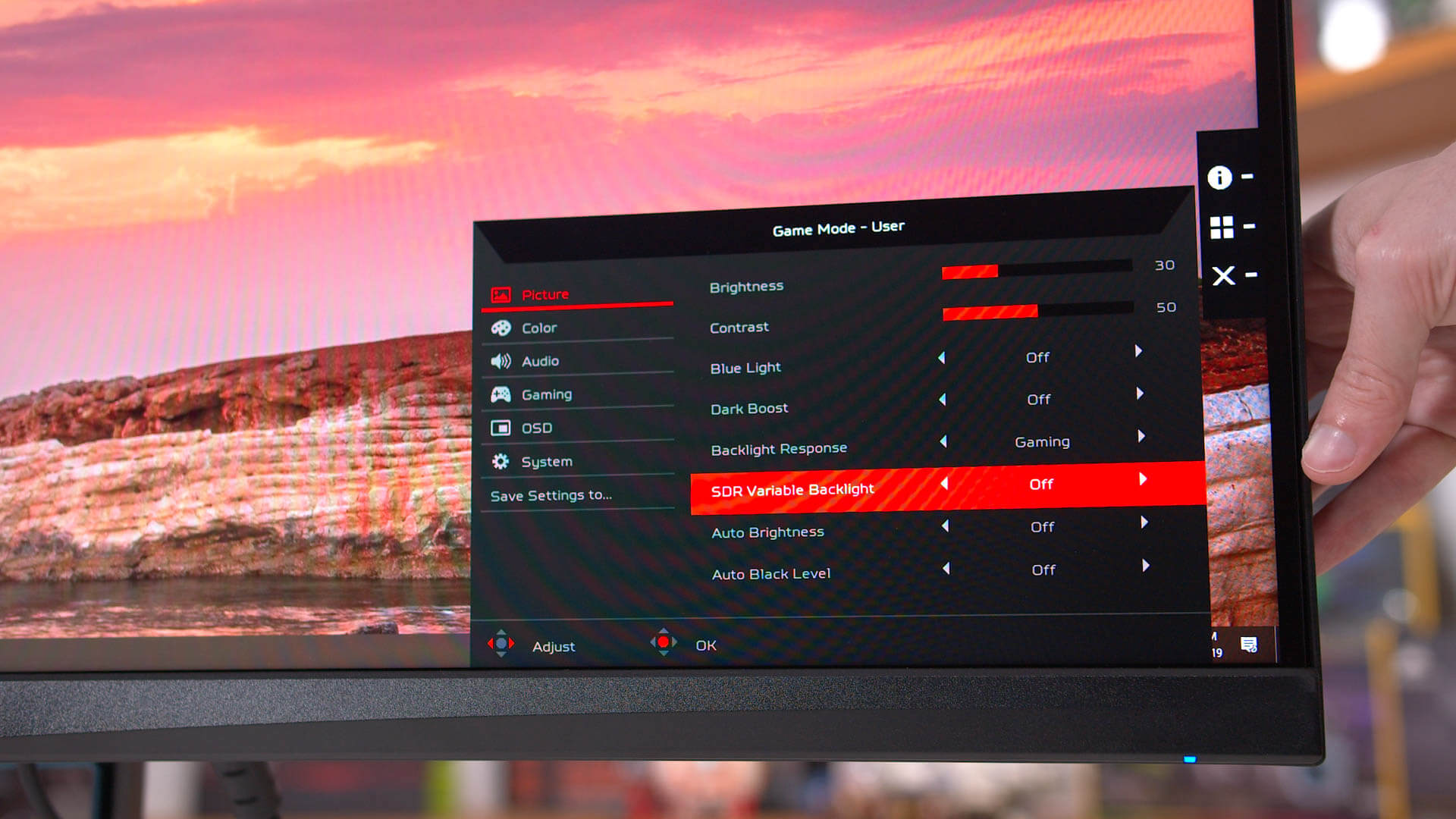 L'affichage à l'écran est contrôlé par une bascule directionnelle. Il dispose également de la gamme standard de fonctionnalités Acer, notamment des réticules de triche, un mode de faible lumière bleue et un mode de renforcement sombre. Comme quelques autres moniteurs que nous avons examinés récemment, il n’existe pas de mode stroboscopique de rétroéclairage pour plus de clarté. C’était probablement trop difficile de travailler avec un rétroéclairage FALD.