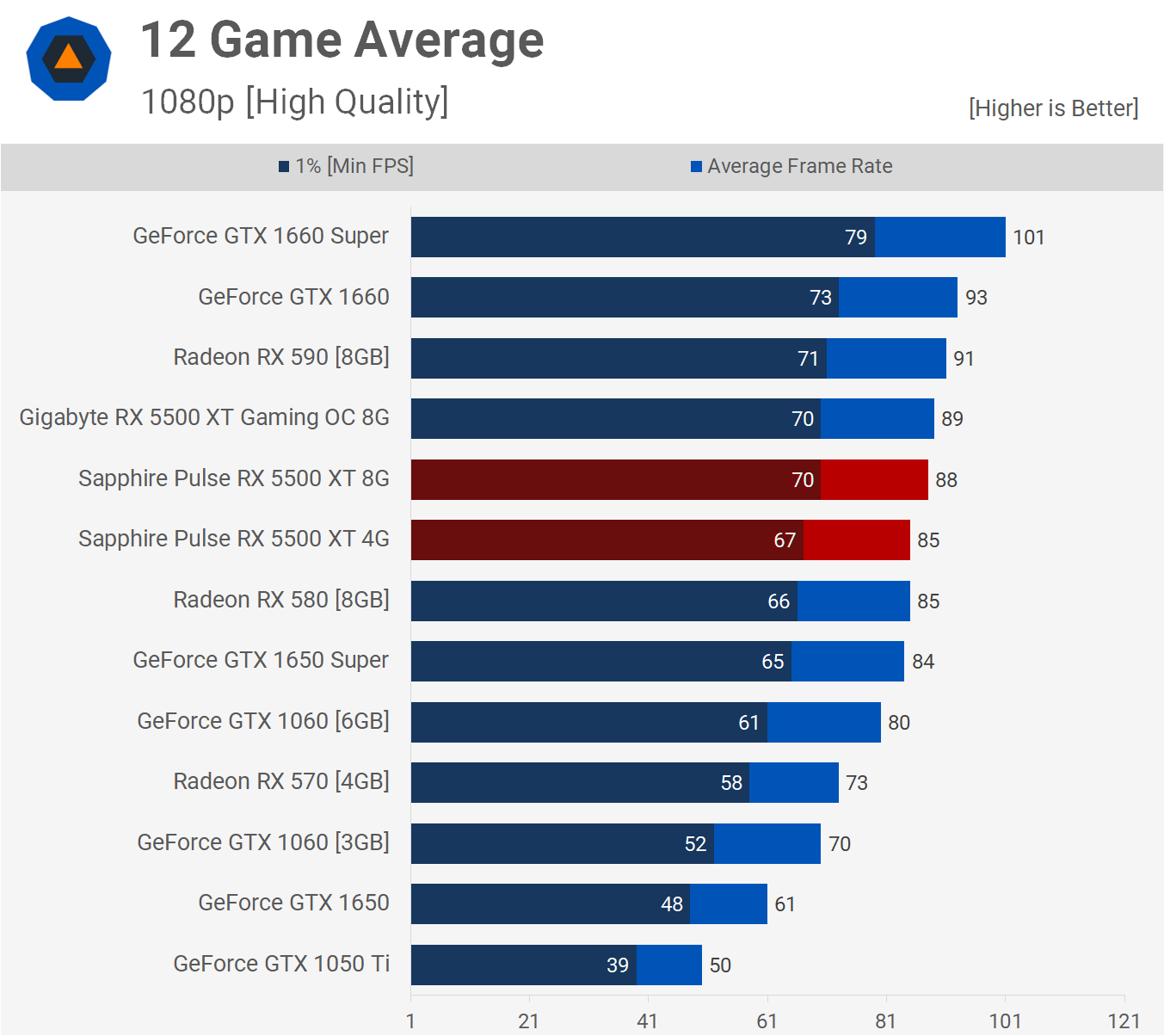 L'examen de ces résultats peut être trompeur car il ne montre pas quand et comment vous pouvez rencontrer des problèmes avec le tampon VRAM 4 Go plus limité. Mais dans l'ensemble, si l'on tient compte de tous les jeux, le 4 Go 5500 XT n'était que de 3,5% plus lent que la version 8 Go, ce qui le plaçait au même niveau que le RX 580 et le GTX 1650 Super.
