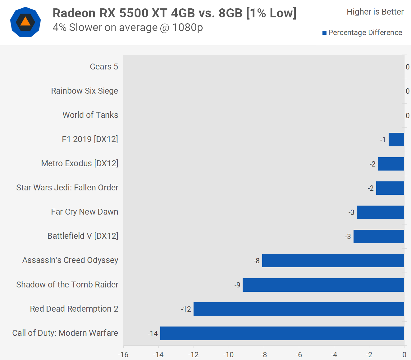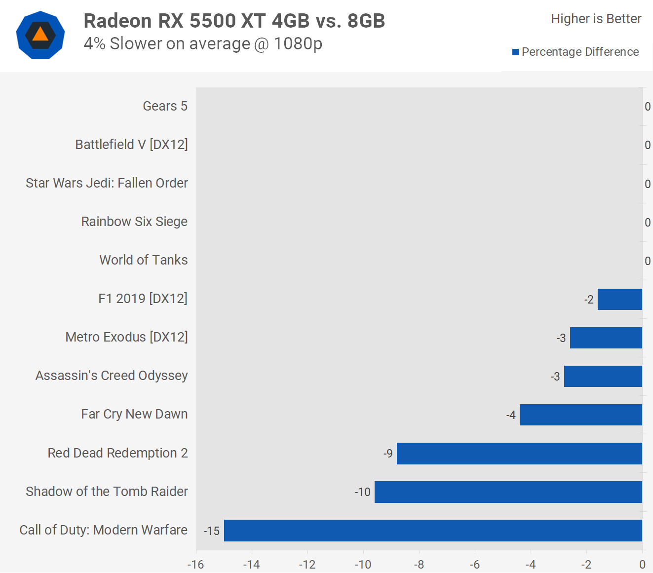 En conclusion, nous avons quelques graphiques RX 5500 XT 4 Go contre 8 Go qui montrent les marges par jeu. Ici, vous pouvez voir que le modèle 4 Go a connu des difficultés dans Call of Duty Modern Warfare, Shadow of the Tomb Raider et Red Dead Redemption 2, tandis que nous avons vu de petites baisses de performances dans Far Cry New Dawn, Assassin's Creed Odyssey et Metro Exodus, bien qu'elles aient été si petit dans ces titres qu'il ne vaut vraiment pas la peine d'en parler.