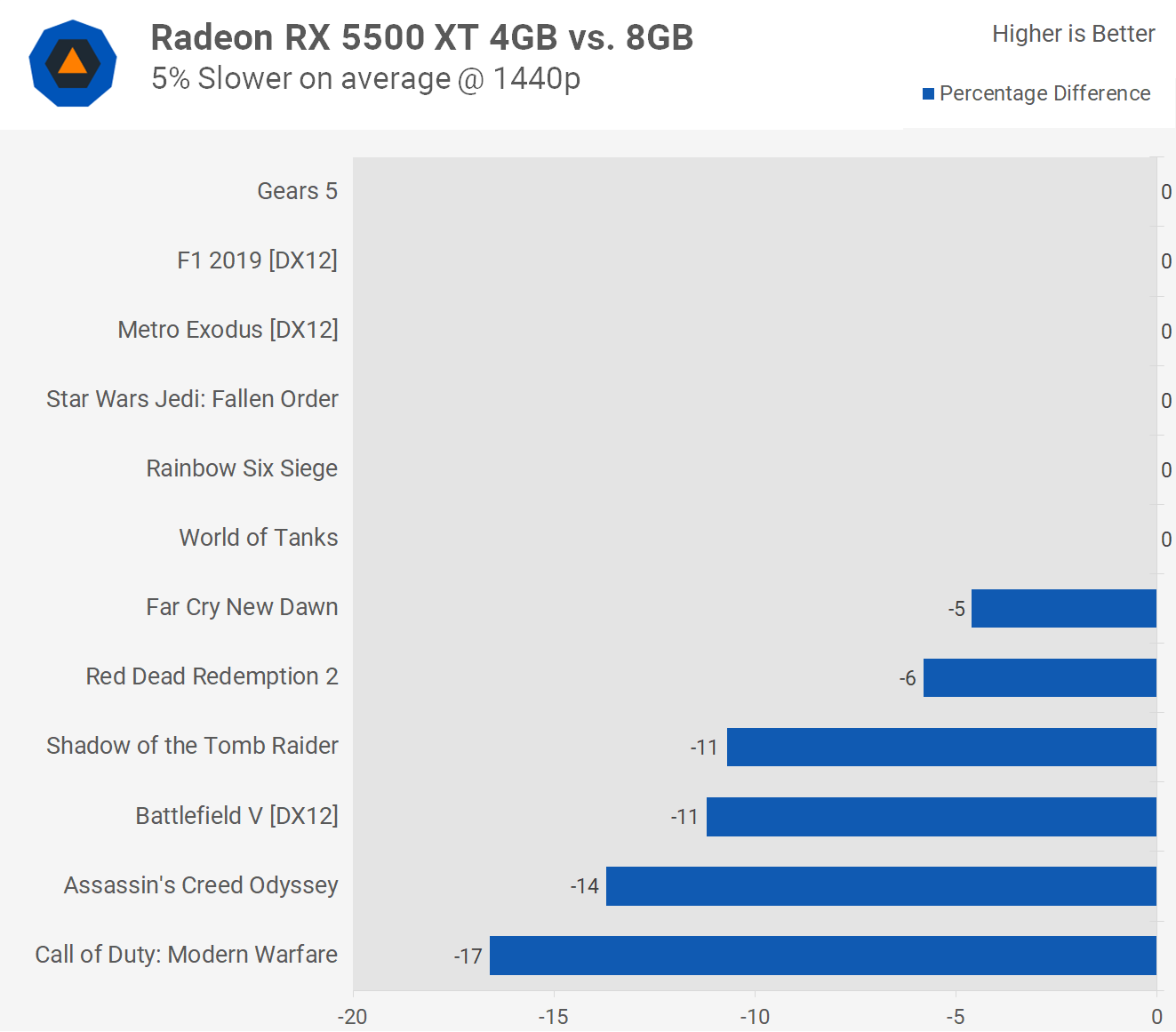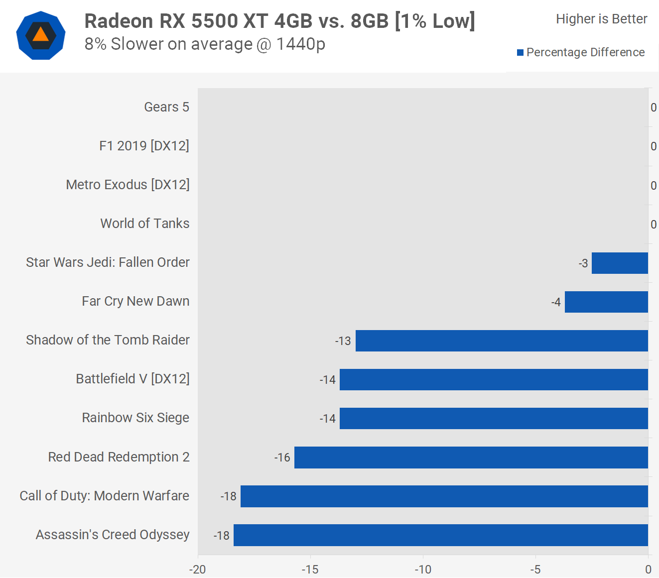 À 1440p, nous ne voyons aucune différence entre les modèles 4 Go et 8 Go pour la moitié des jeux testés, du moins lors de la comparaison des performances de fréquence d'images moyennes. La baisse des performances dans Call of Duty a été importante, nous constatons également une légère baisse dans Assassin’s Creed et des pertes de performances à deux chiffres dans Battlefield V et Shadow of the Tomb Raider.