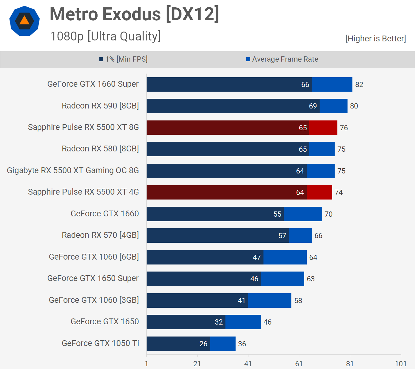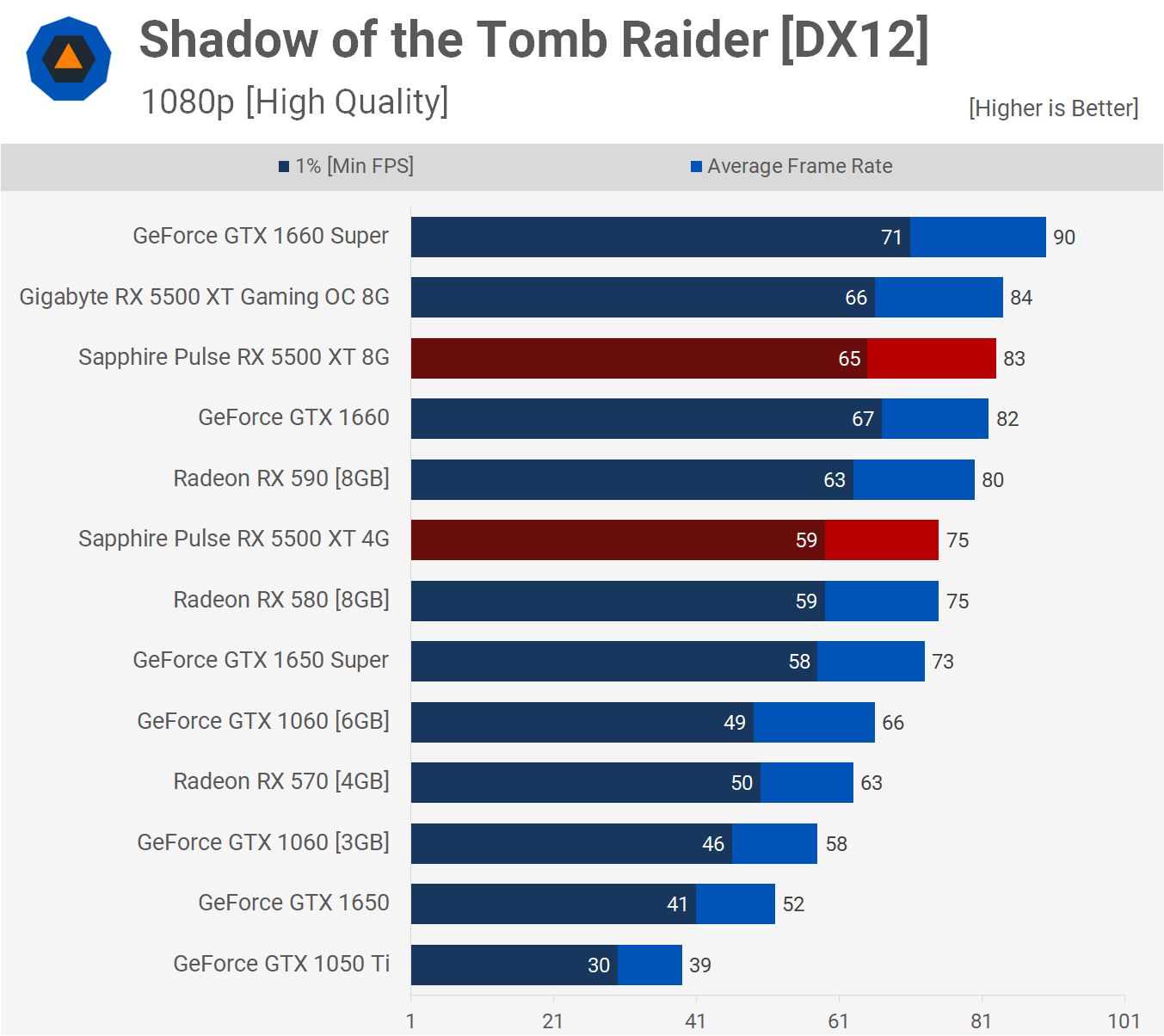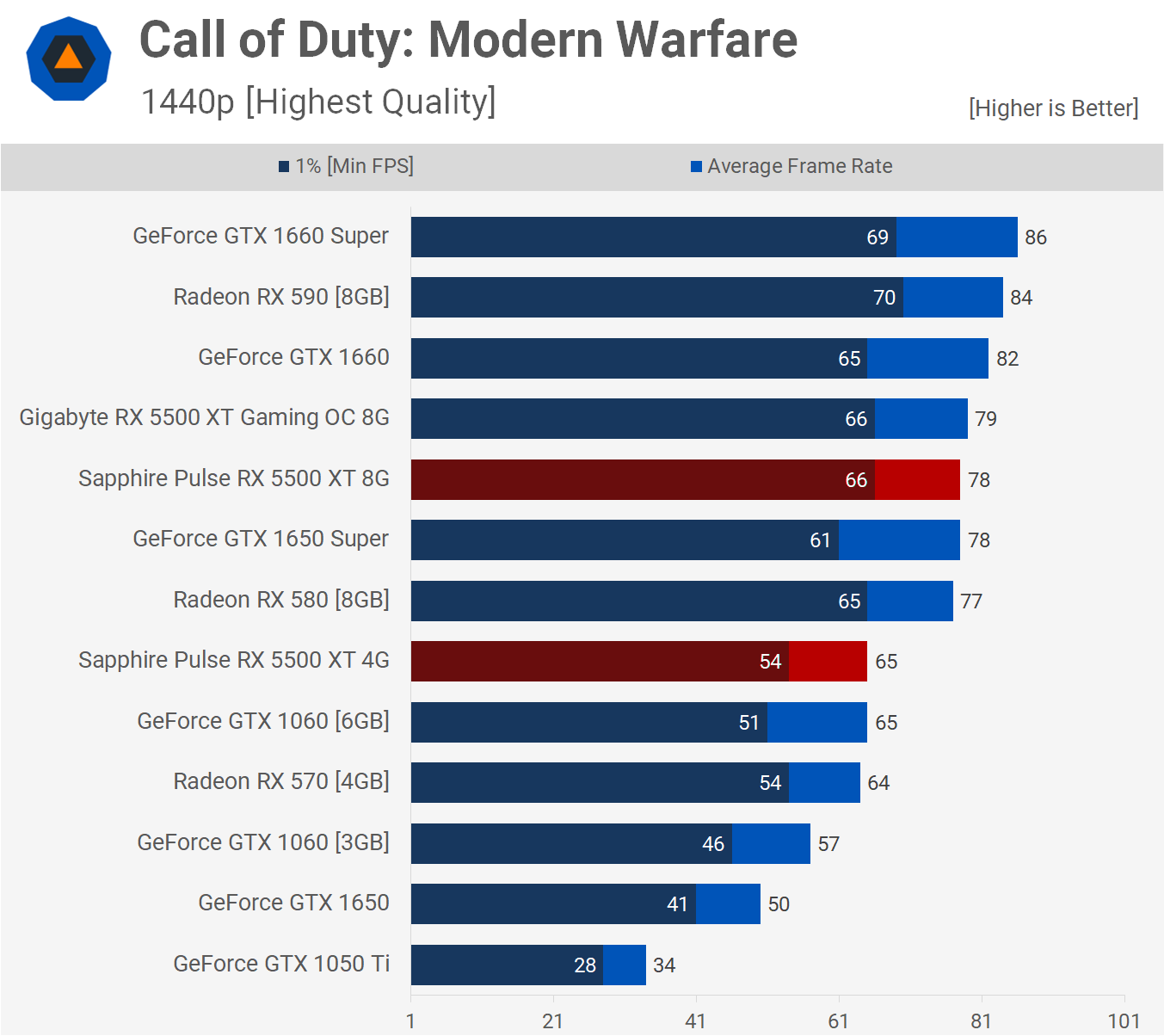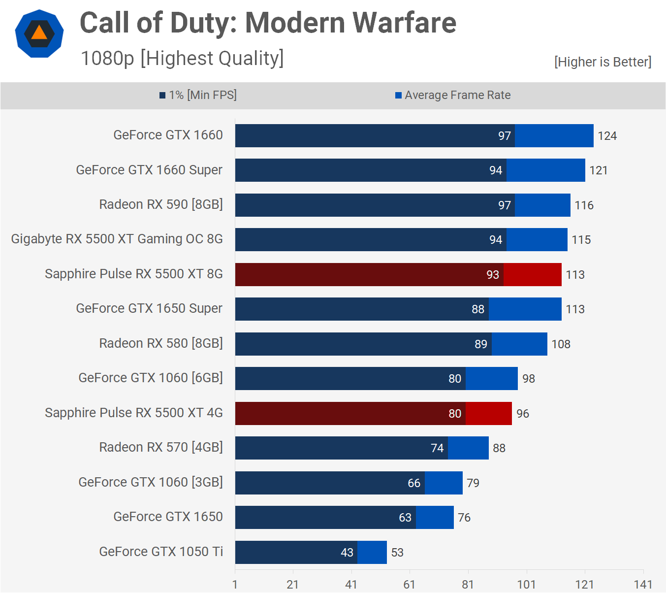 Call of Duty: Modern Warfare est gourmand en mémoire, même en 1080p, bien que nous utilisons les paramètres de qualité les plus élevés possibles. Le 4 Go 5500 XT affichait en moyenne un impressionnant 96 fps, mais c'était toujours 15% derrière la version 8 Go, ainsi que le GTX 1650 Super de Nvidia.