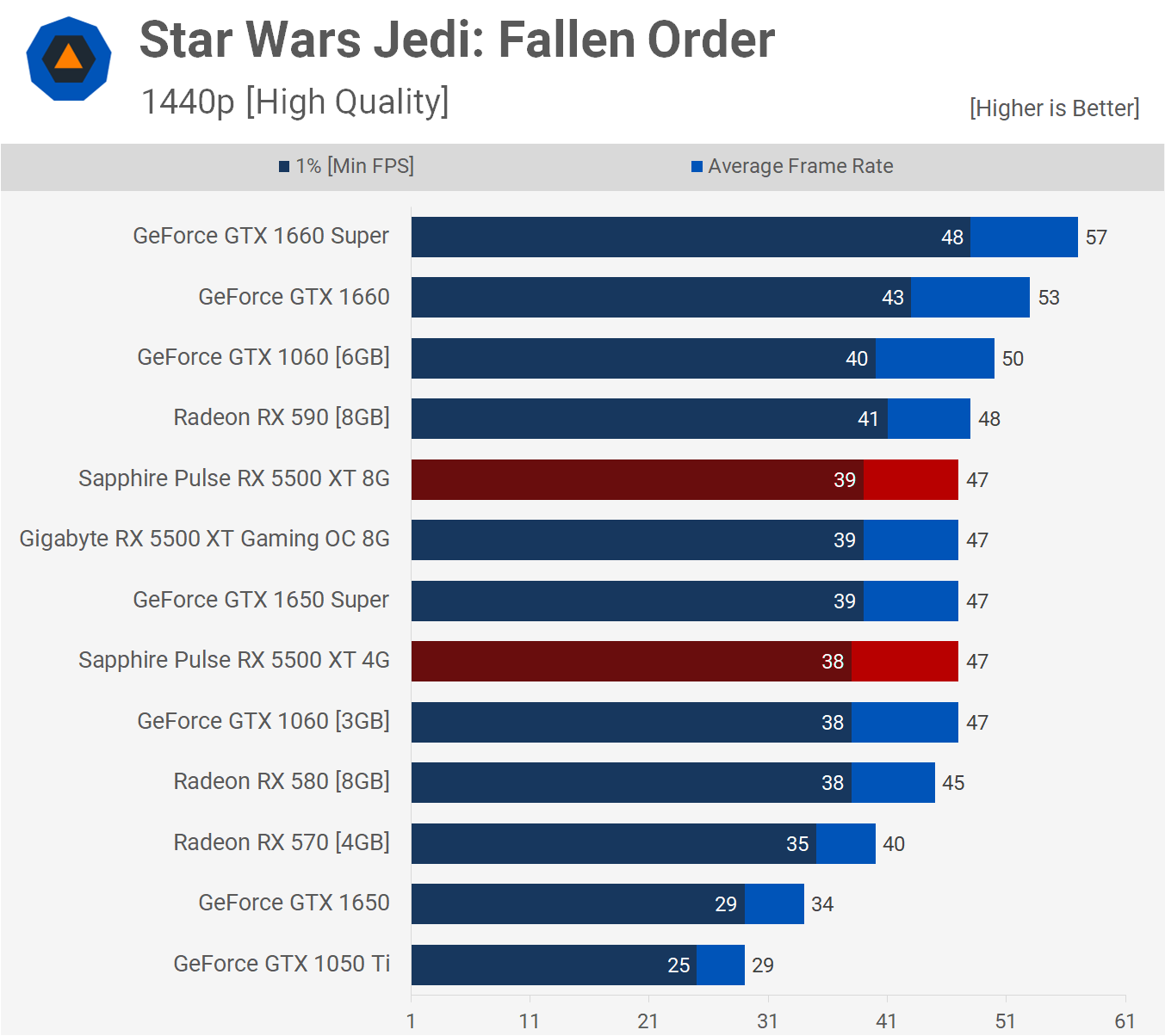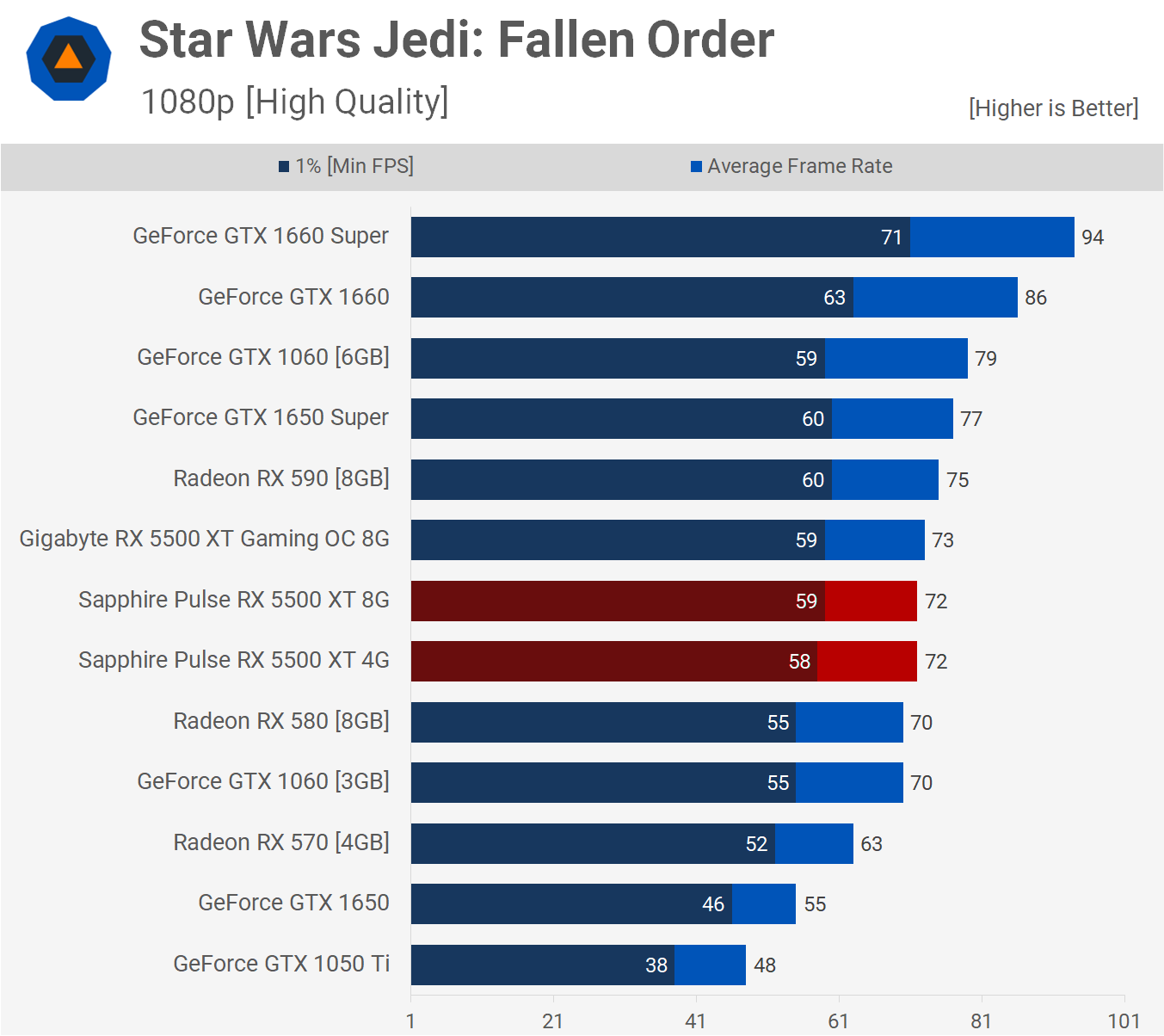 Ensuite, nous avons Star Wars Jedi: Fallen Order et à 1080p en utilisant le préréglage de haute qualité qui est un pas en dessous du paramètre maximum 'Ultra', nous ne voyons aucune différence de performances entre les versions 4 Go et 8 Go du 5500 XT.