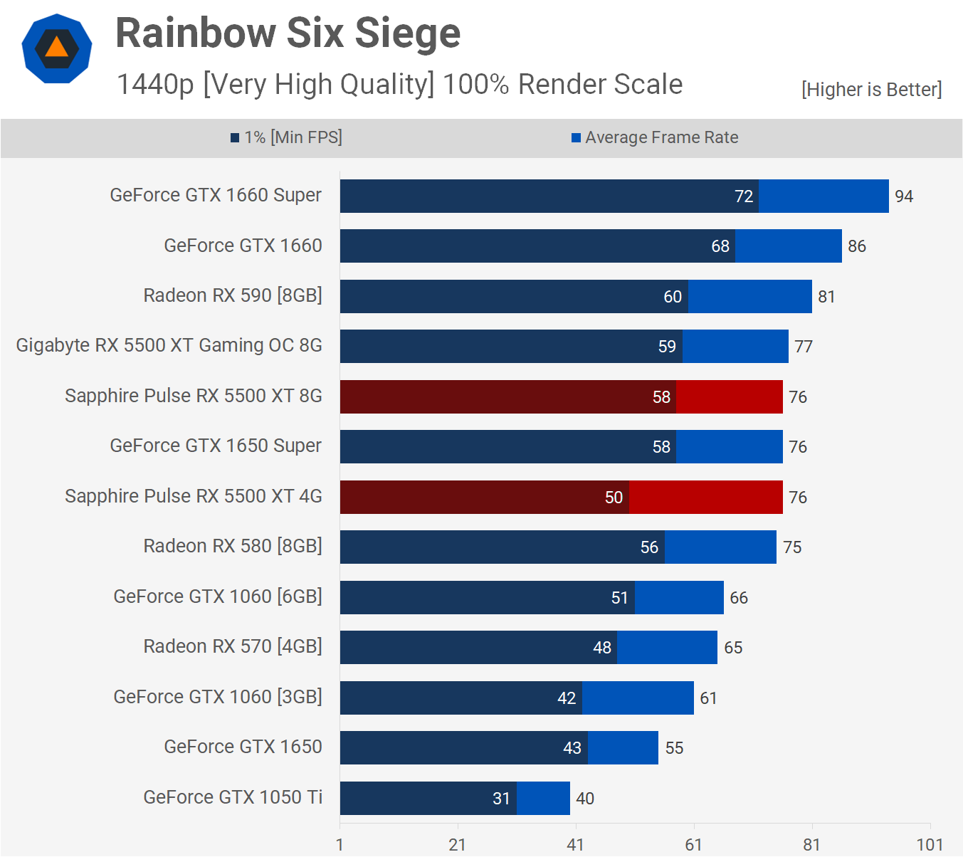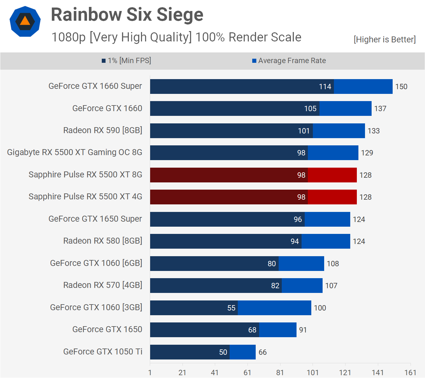Nous ne jouons pas à Rainbow Six Siege avec les paramètres de qualité visuelle les plus élevés, mais plutôt au deuxième préréglage de qualité avec une échelle de rendu manuelle de 100%. Cela a vu les modèles 4 et 8 Go 5500 XT offrir les mêmes 128 fps en moyenne à 1080p.