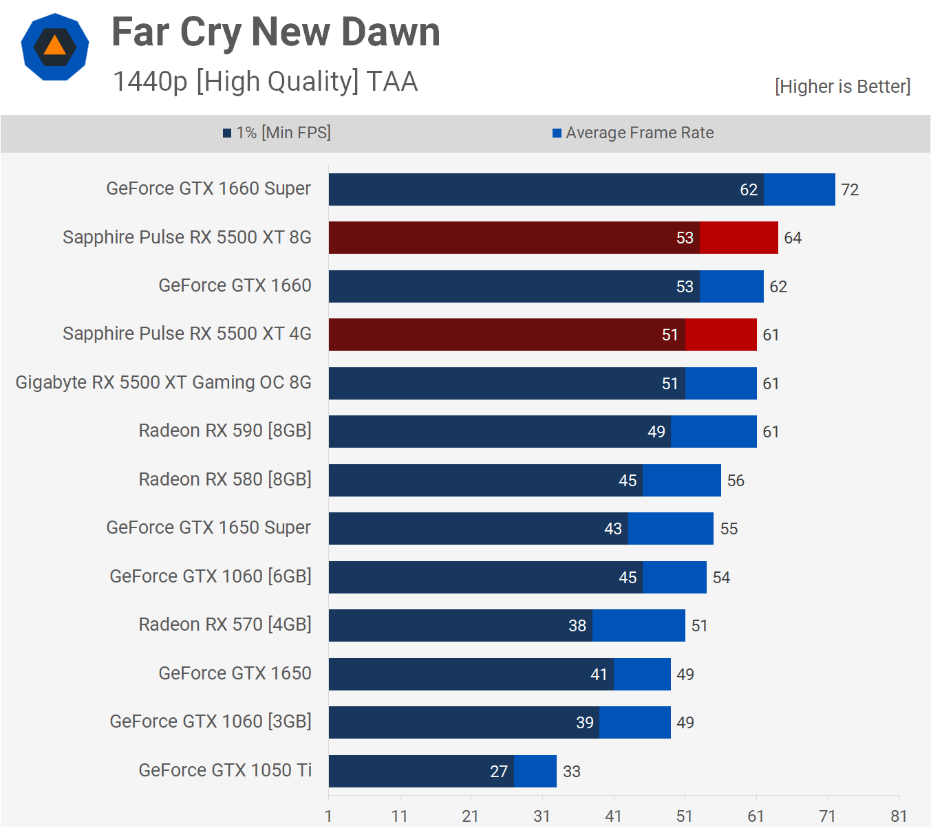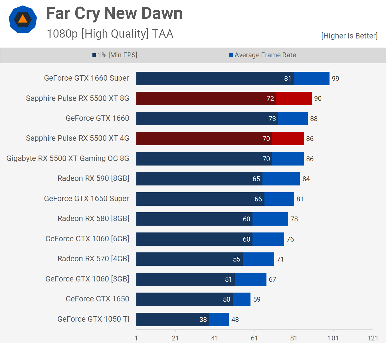 Le 4 Go 5500 XT perd quelques images par rapport au modèle 8 Go de Far Cry New Dawn, mais les performances globales à 1080p en utilisant le deuxième préréglage de la plus haute qualité sont toujours très bonnes.