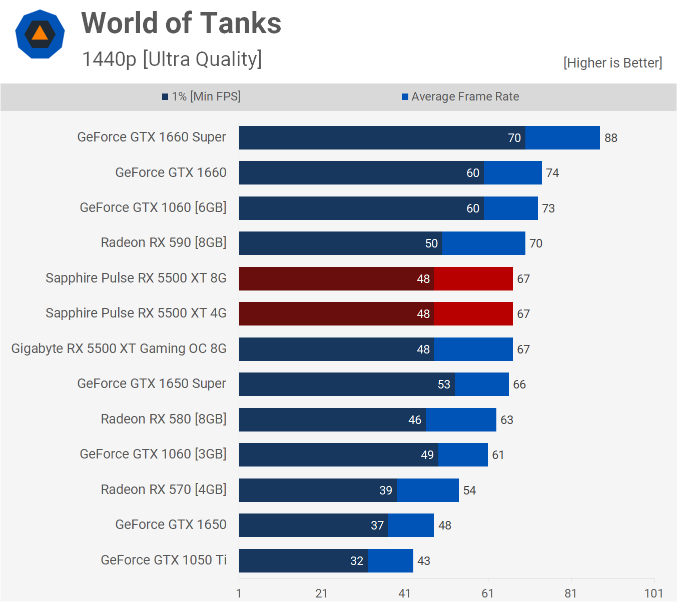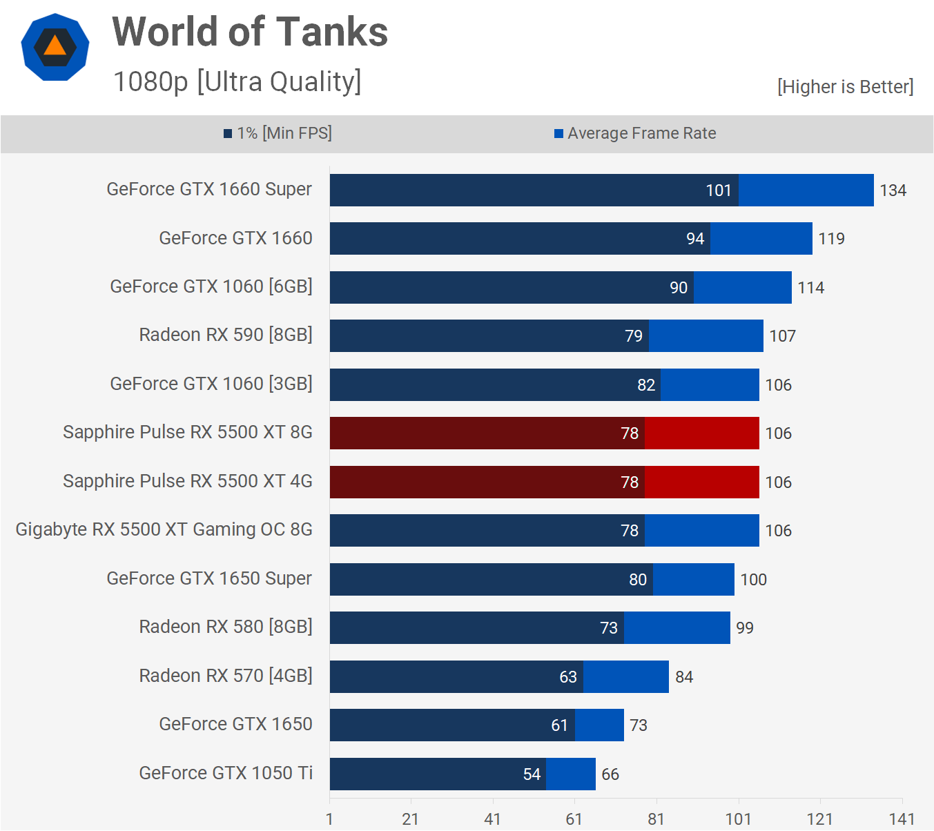 Passant à World of Tanks, ce jeu alloue seulement environ 3 Go de VRAM à 1440p en utilisant les paramètres de qualité maximale du jeu avec la version client HD. Ainsi, en 1080p, nous ne voyons aucune différence entre les versions 4 Go et 8 Go du 5500 XT.