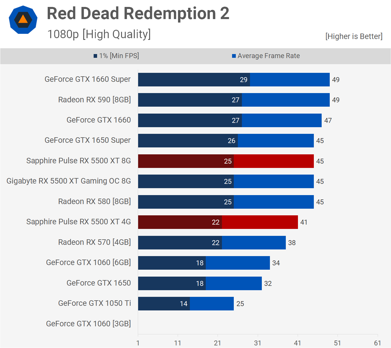 Nous devrons mettre à jour le test Red Dead Redemption 2 pour ces GPU bas de gamme avec des paramètres de qualité moyenne à faible dans un proche avenir, le niveau élevé est tout simplement trop pour cette classe de GPU. À 1080p, le 4 Go 5500 XT voit un rendement de 9%, ce qui n'est pas génial et cela le rend également 9% plus lent que le 1650 Super.