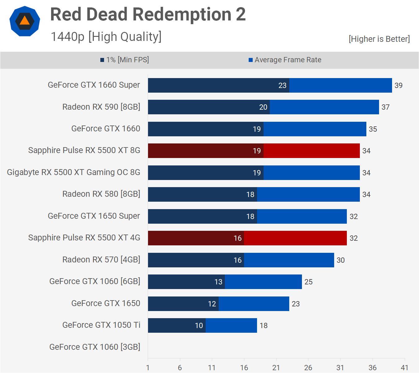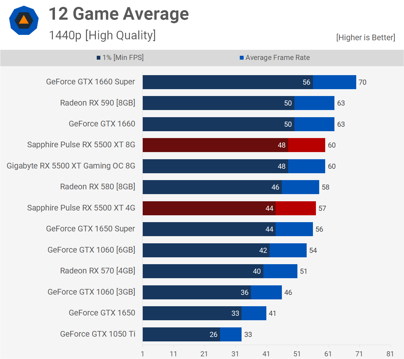 Cependant, l'histoire change à 1440p où le 4GB 5500 XT se débat et le taux de rafraîchissement moyen chute de 11%. Cela signifie que le 5500 XT ne pouvait désormais égaler que le 1650 Super et le RX 570.