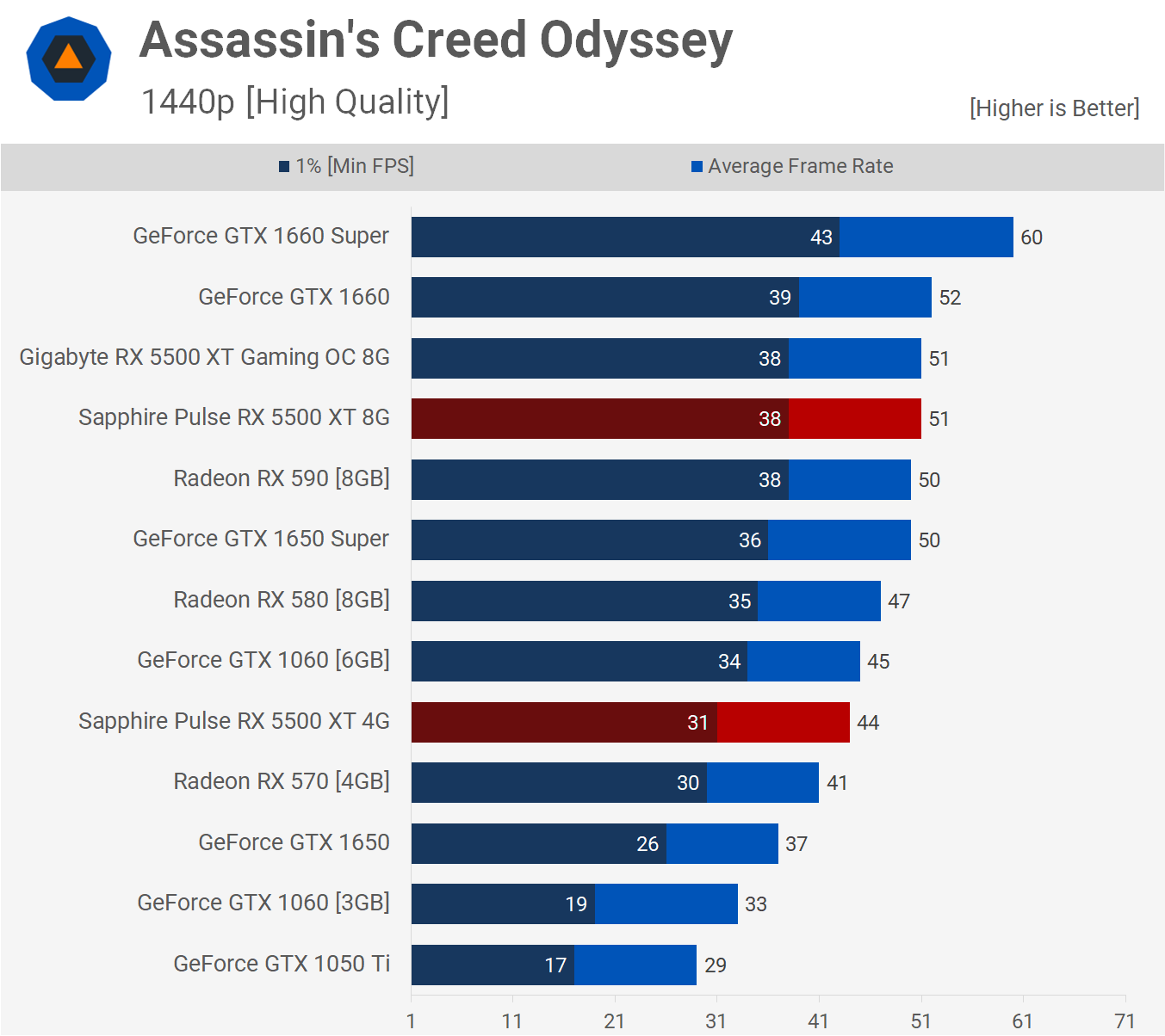 La baisse des performances de la version 4 Go dans Assassin's Creed Odyssey à 1080p est assez minime, ce qui, en termes de performances, est également comparable à la GTX 1650 Super.