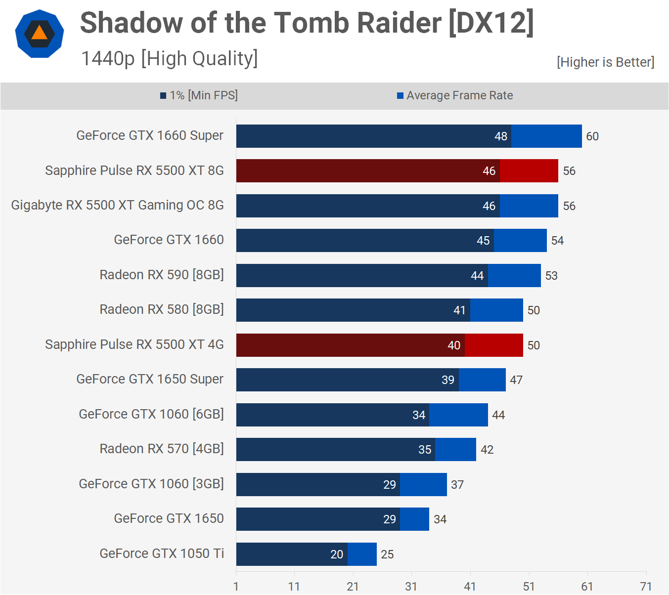À 1440p, nous observons les mêmes performances. Dans ce jeu, la Radeon 5500 XT offrait essentiellement le même niveau de performances que le 1650 Super et même le 3GB GTX 1060.