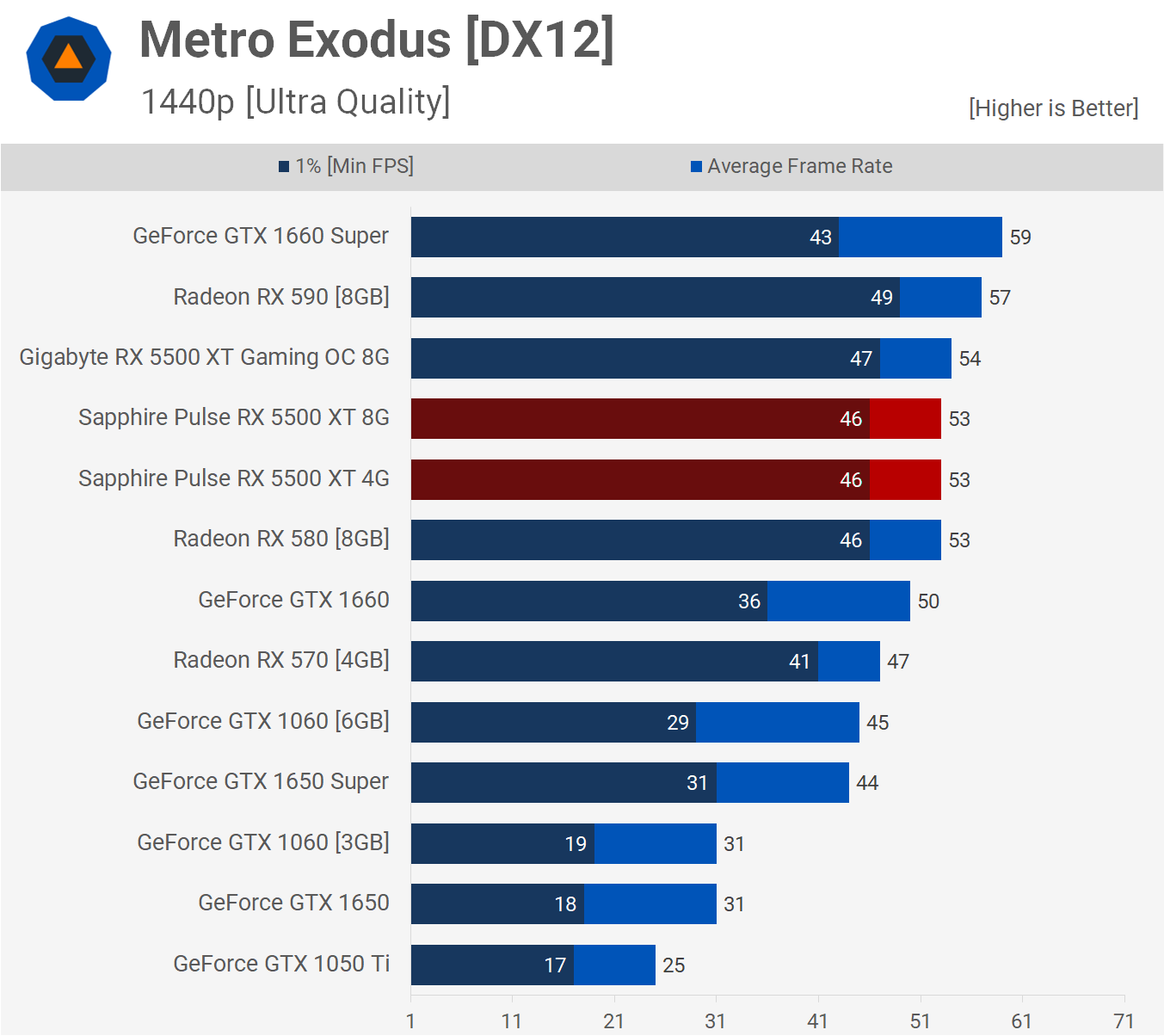 En testant avec Metro Exodus en utilisant les paramètres de qualité ultra, le 4GB 5500 XT s'y accroche plutôt bien, correspondant à la version 8GB ainsi qu'au 8GB RX 580. Nous voyons à peu près la même chose à 1440p et cette fois, le 4GB 5500 XT était bien plus rapide que la GTX 1650 Super, produisant environ 20% de cadres en plus.