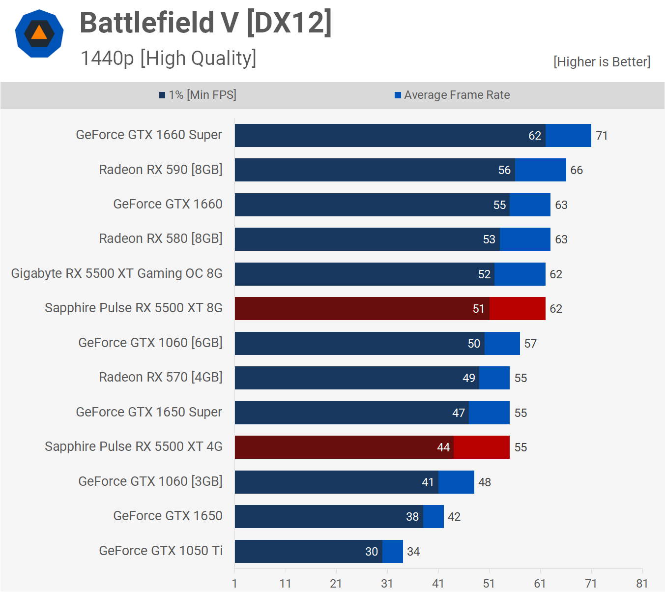 Cependant, les choses empirent pour le RX 5500 si nous regardons un seul titre comme Battlefield V. Nous utilisons les données 1440p ici car cela représente une situation où la capacité de 4 Go de VRAM commence à avoir un impact considérable sur les performances, ce que vous verrez sans aucun doute plus dans la prochaine année ou deux.