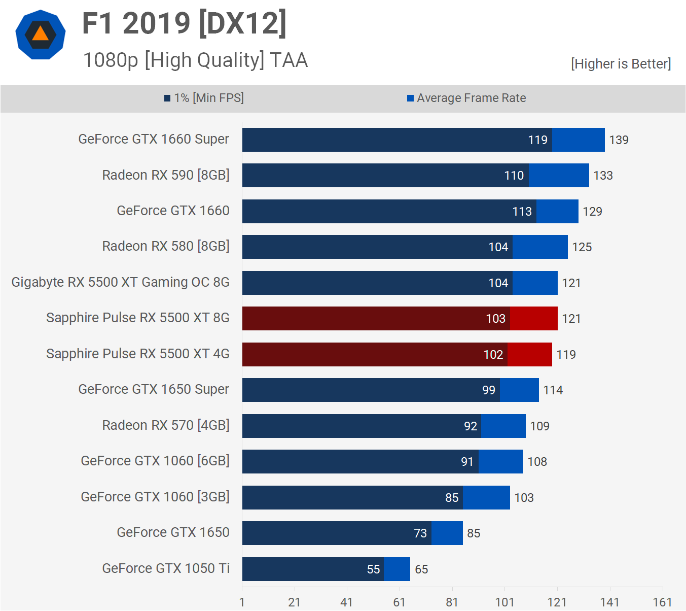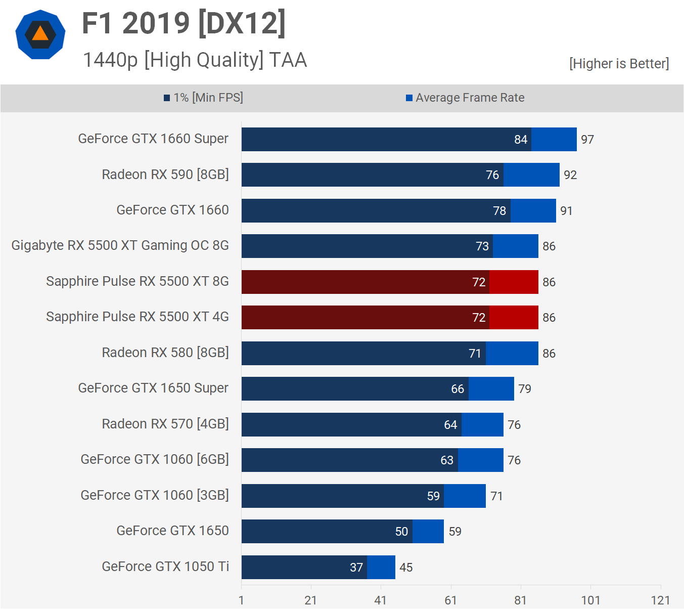 F1 2019 ne consomme pas beaucoup de mémoire et, par conséquent, les versions 4 et 8 Go du 5500 XT ont permis le même niveau de performances à 1080p. C'est la même situation à 1440p, où le 4 Go 5500 XT était bon pour 86 fps en moyenne, les mêmes performances que vous obtiendrez du RX 580.
