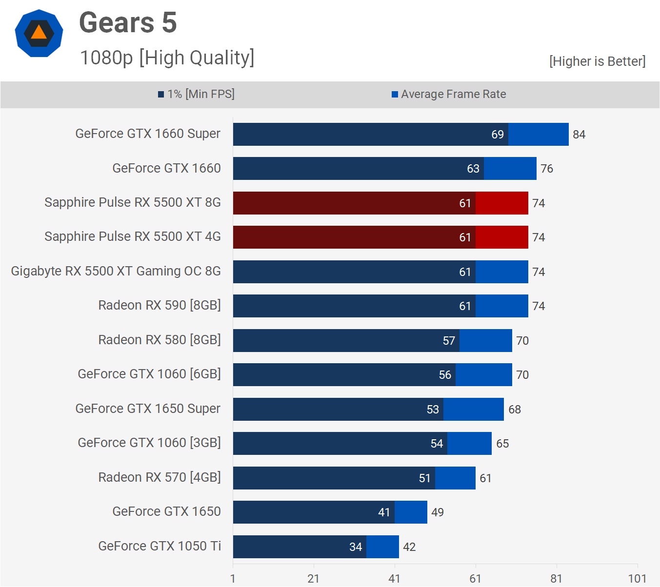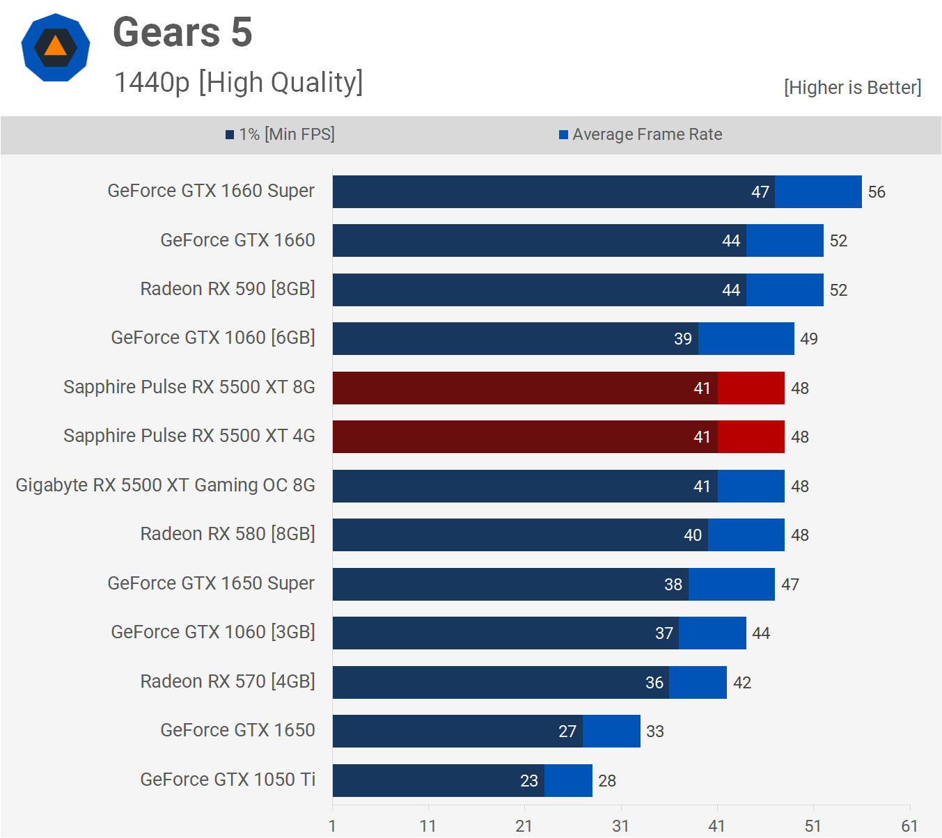 Enfin, nous avons Gears 5, où nous ne voyons aucune différence de performances entre les versions 4 et 8 Go du 5500 XT. À 1440p, les deux modèles ont craché 48 fps, ce qui est le même niveau de performance que celui offert par les RX 580 et GTX 1650 Super.