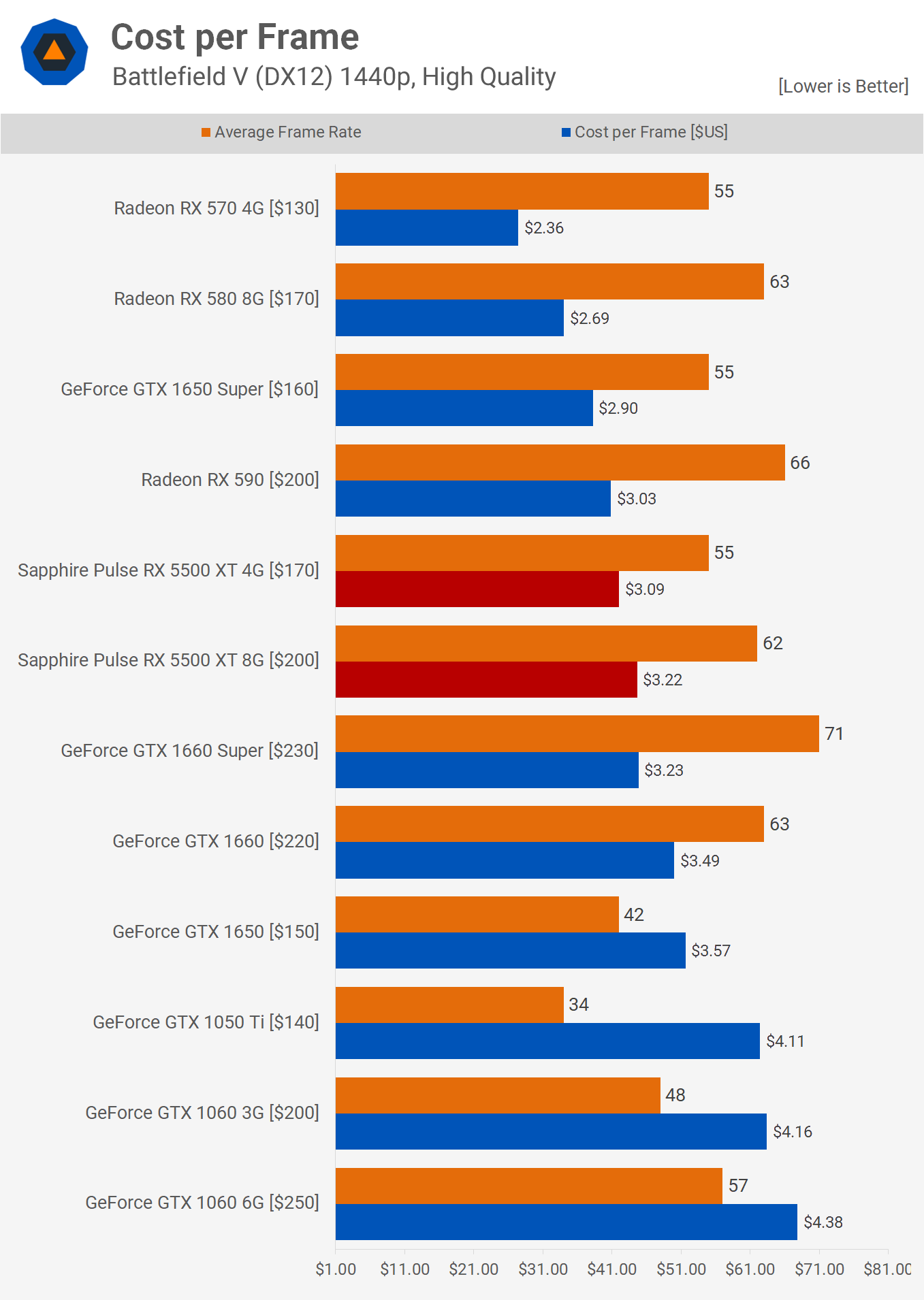 En prenant les moyennes des données 1080p, nous voyons que le 4 Go 5500 XT est capable de correspondre au coût par image du RX 580, vous échangez donc la moitié de la VRAM pour un produit plus efficace et nous en discuterons dans un instant.