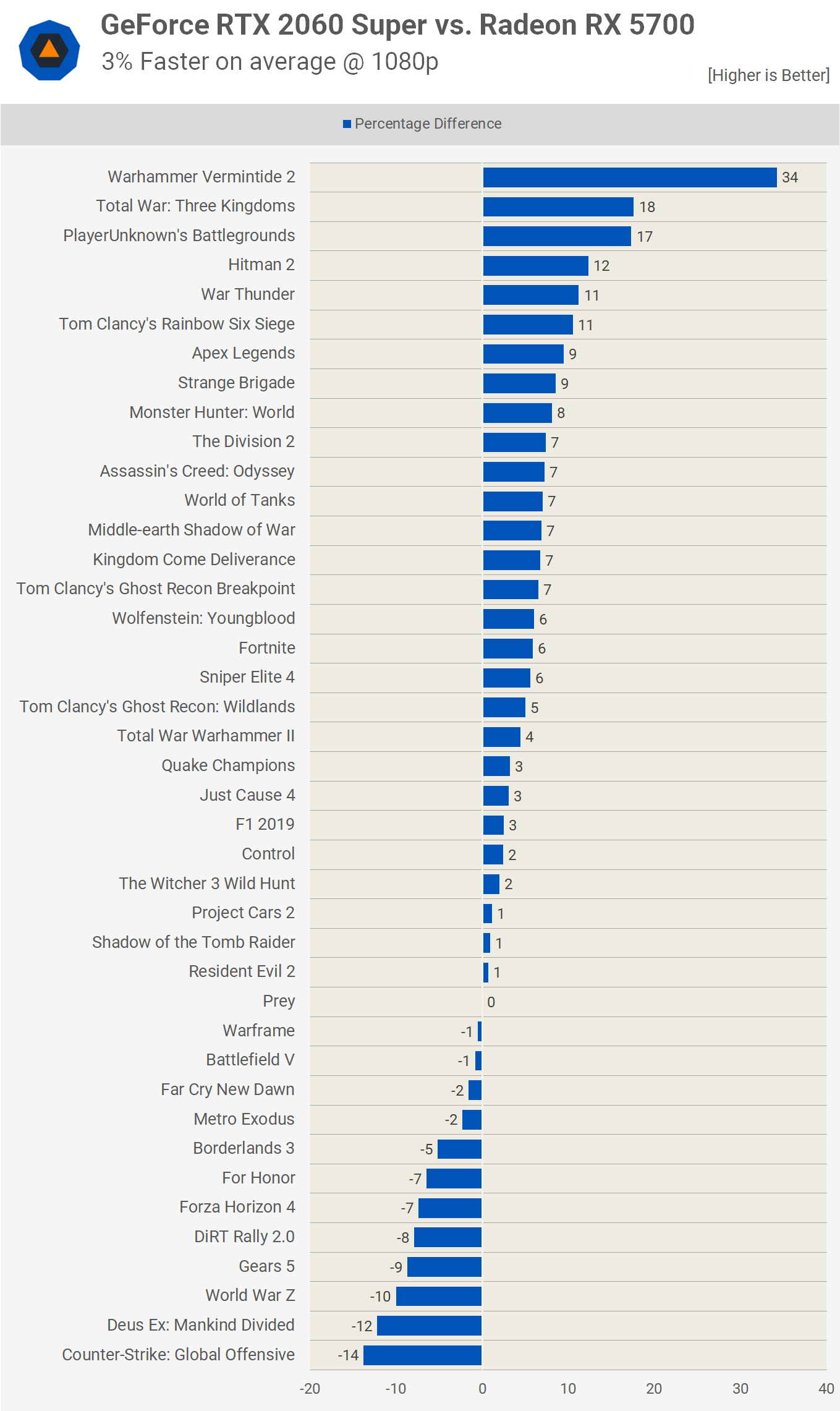 À 1080p sur 41 jeux testés comme indiqué ci-dessus, le GeForce RTX 2060 Super est environ 3% plus rapide en moyenne. La plus grosse exception ici était Vermintide 2, où le RTX 2060 Super était 34% plus rapide, mais même si l’on élimine ce résultat, le GPU GeForce était toujours 3% plus rapide en moyenne et c’est la beauté de tester autant de jeux que les autres ne l’ont pas. sur le résultat global.