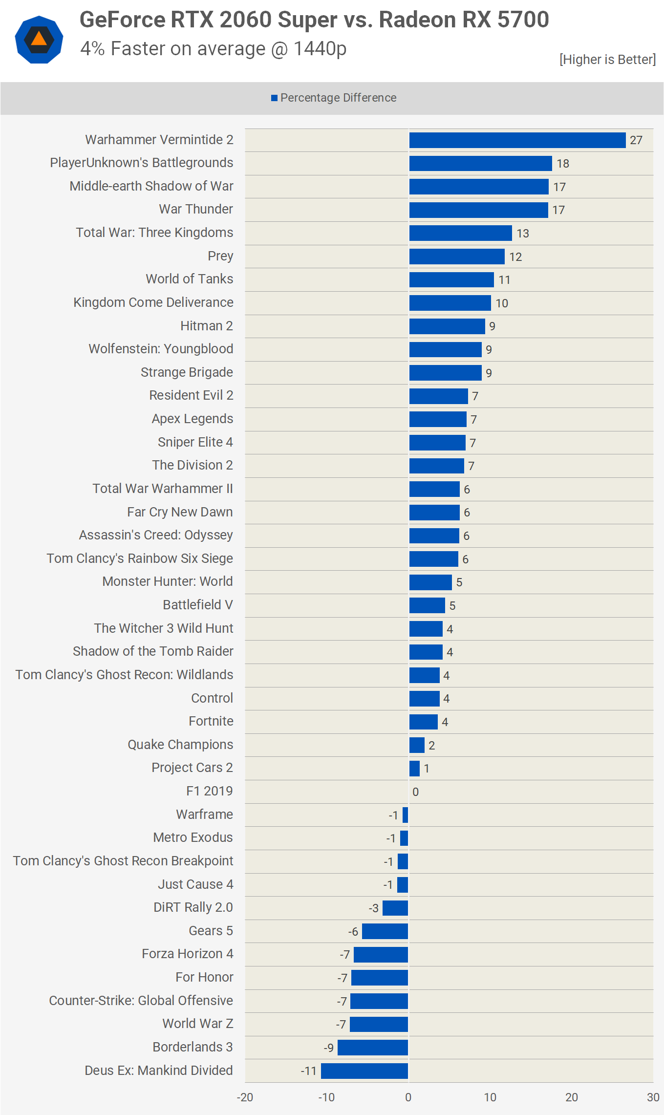 Comme indiqué sur le graphique ci-dessous, le Super 2060 passe à 1440p, il est 4% plus rapide en moyenne lorsque l’ensemble des 41 matchs est joué. Nous avons une marge globale inférieure à 5%, ce qui signifie que, pour l’essentiel, les performances vont être proches avec l’un ou l’autre des GPU, comme nous l’avons observé au cours de la douzaine de jeux que nous avons examinés de près.