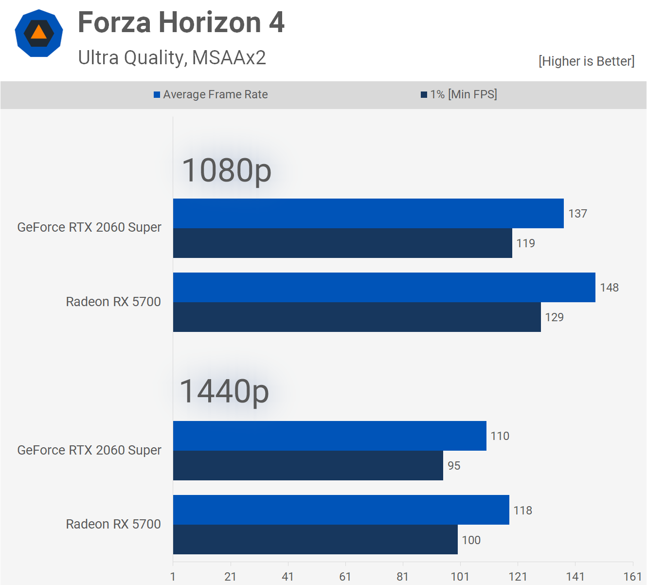 À sa sortie, la Radeon RX 5700 était 31% plus rapide que la 2060 Super avec les tests avec Forza Horizon 4. Toutefois, un pilote récent de Nvidia a amélioré les performances d'environ 20-25% pour les GPU basés à Turing, de sorte que le 5700 ne représente plus que 8%. plus rapide, bien que les deux GPU aient poussé plus de 100 fps en 1080p et en 1440p.