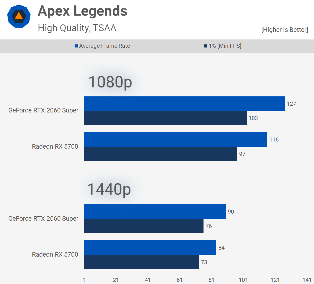 Nvidia bénéficie généralement d’un avantage de performance dans Apex Legends et nous le voyons exactement lorsque nous comparons les Super 5700 et 2060. Le GPU GeForce était 9% plus rapide en 1080p et 7% plus rapide en 1440p, pas de grandes marges, mais une victoire pour l'équipe verte.