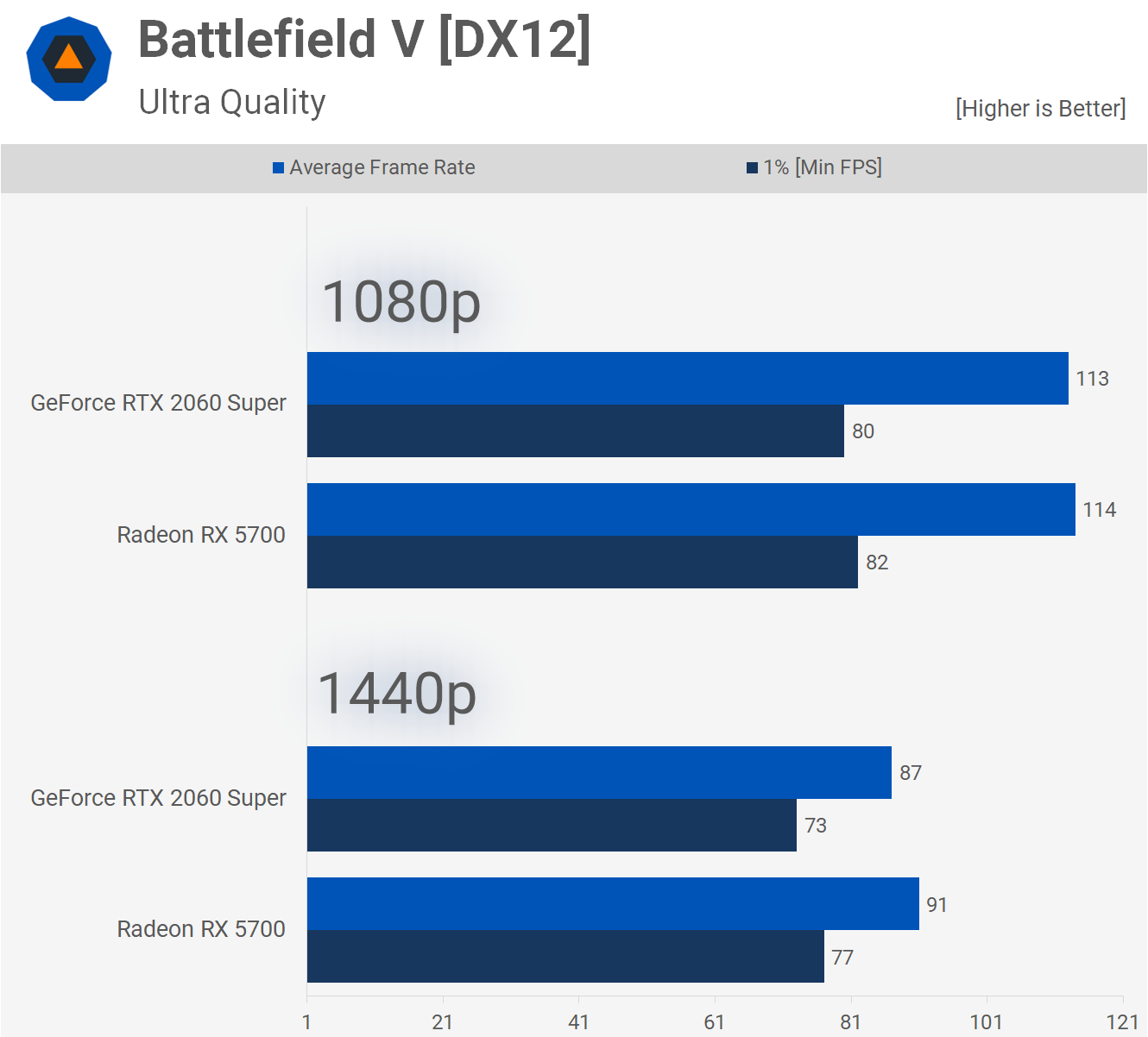 Les résultats de Battlefield V sont extrêmement compétitifs. Ici, le 5700 n’était qu’une image plus rapide en 1080p et seulement 5% plus rapide en 1440p, ce qui donne globalement une expérience de jeu très similaire avec l’un ou l’autre des GPU.