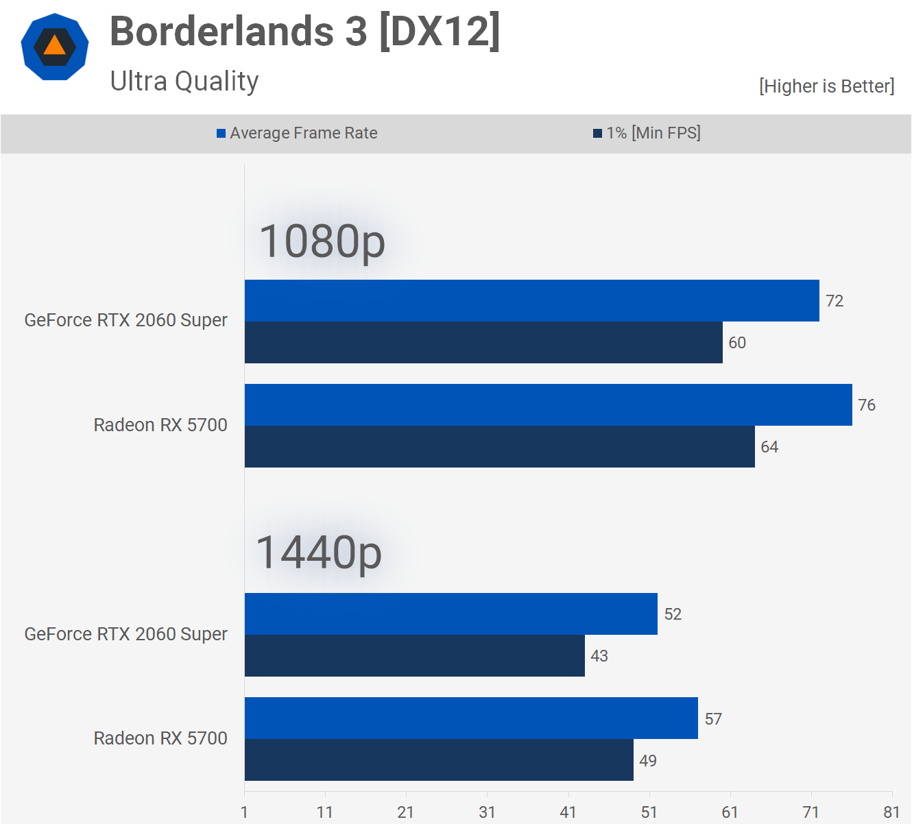 Avec Borderlands 3, la Radeon RX 5700 offre des vitesses de trame plus élevées aux deux résolutions testées, bien que les marges ne soient pas énormes. Le 5700 est 6% plus rapide à 1080p et 10% plus rapide à 1440p. À la réflexion, la marge de 1440p est raisonnablement importante et vous remarquerez une augmentation de 14% par rapport à une performance inférieure de 1%.