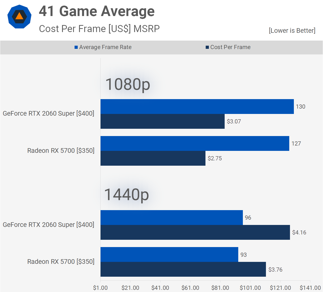 Pour l'analyse du coût par image, nous utilisons le PDSF car il est possible d'acheter le RX 5700 ou le RTX 2060 Super à ces prix. Cela signifie que vous paierez 12% de plus par image pour le GPU GeForce basé sur les données 1080p, ou 11% de plus sur les données 1440p. Dans cet examen, nous savions que la Radeon était un peu plus abordable. Par conséquent, sur la base des résultats de performances, le RTX 2060 Super coûte un peu plus de 10%.