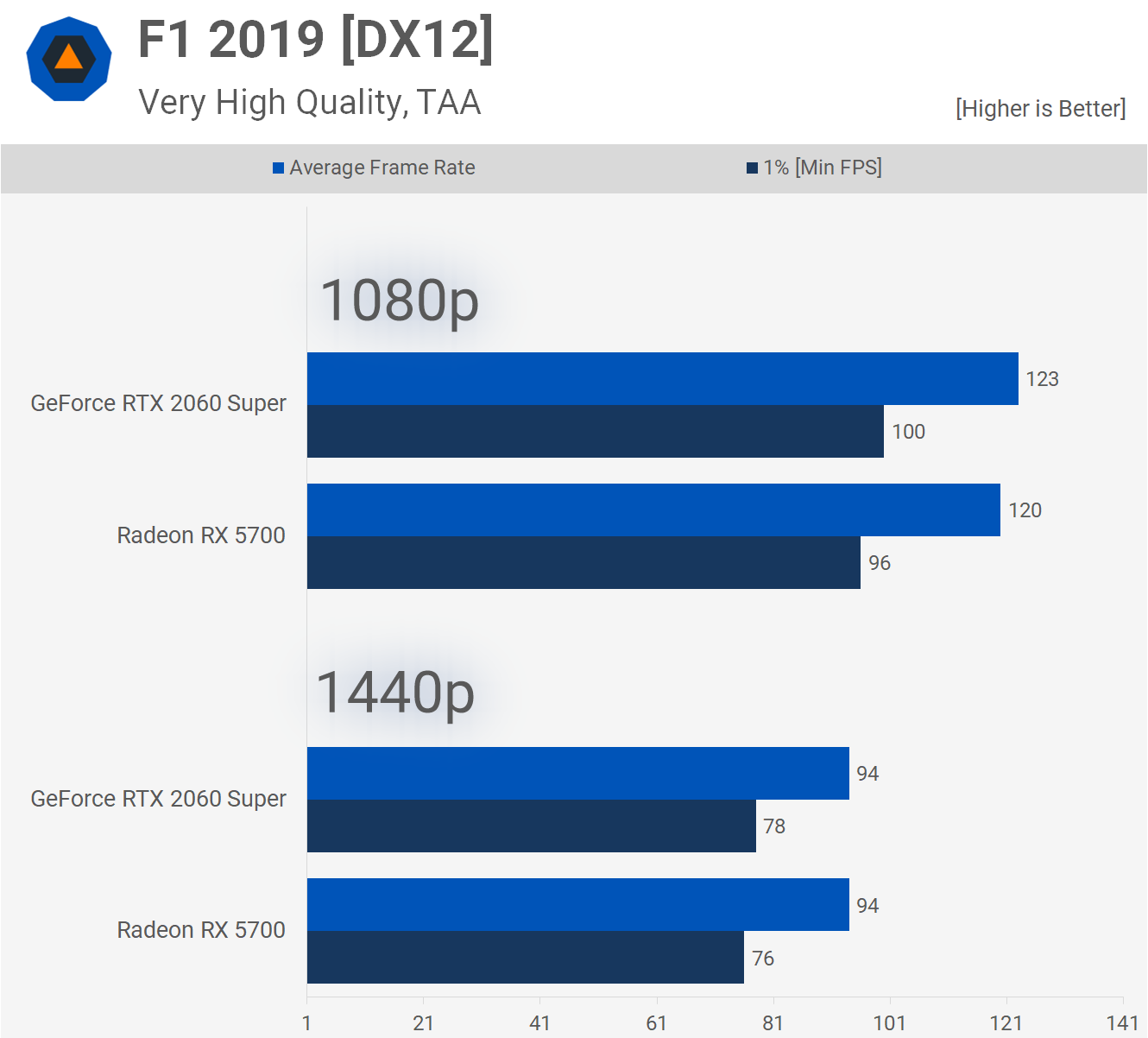 Les résultats de la F1 2019 sont très compétitifs: la 2060 Super était légèrement plus rapide en 1080p alors que nous constatons des performances identiques à 1440p. Les deux GPU ont maintenu bien plus de 60 fps à 1440p.