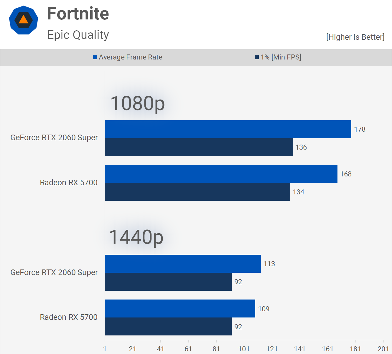 Fortnite est un titre très populaire et vous constaterez des taux de trame élevés avec le 5700 ou le 2060 Super. Le GPU GeForce était 6% plus rapide en 1080p, même si 1% de performances faibles était identique, puis à 1440p, nous voyons une marge allant jusqu'à 4% en faveur de l'équipe verte.