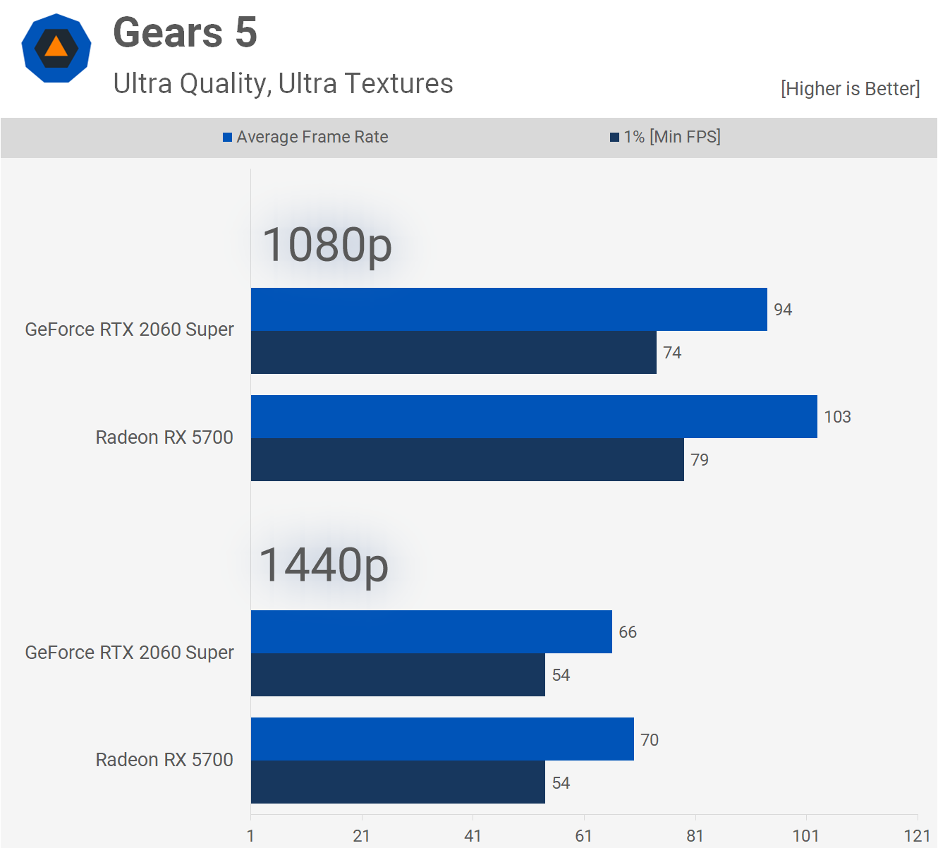 Le processeur graphique Radeon était également plus rapide lors des tests avec Gears 5, car il bénéficie d’une marge de performance pouvant atteindre 10% à 1080p. Les résultats sont plus compétitifs à 1440p et bien que nous voyions le même rendement faible de 1%, le 5700 était plus rapide que la comparaison des taux de trame moyens.
