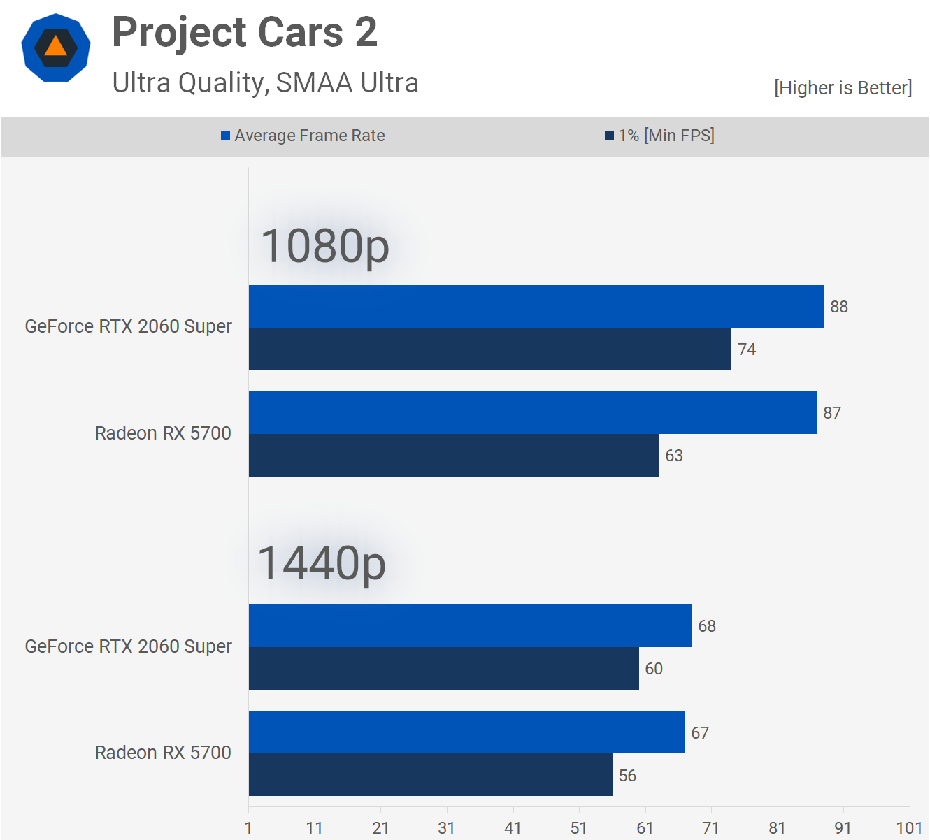 Le 5700 présente des performances plutôt faibles de 1% en 1080p lors des tests avec Project Cars 2. Ces données reposent bien entendu sur trois exécutions en moyenne. Dans ce cas, les trois passages signalaient les mêmes 63 ips. Malgré la faible performance médiocre de 1%, le taux de trame moyen était comparable à celui du Super 2060 et nous constatons une performance globale plus compétitive à 1440p.