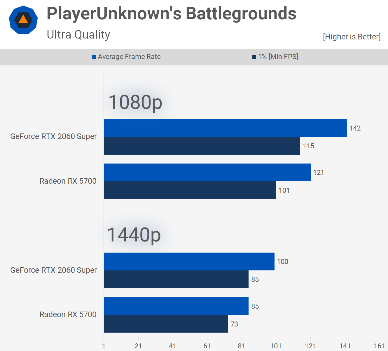 Les fans de PUBG ont toujours été mieux servis par les GPU GeForce et cela reste la situation encore aujourd'hui. Le 2060 Super était environ 17% plus rapide aux deux résolutions et vous volonté remarquez cette performance supplémentaire dans ce titre. Cela dit, si vous jouez avec des réglages compétitifs, les cadences de prise de vue seront tellement élevées que le GPU que vous utiliserez n’aura pas vraiment d'importance.