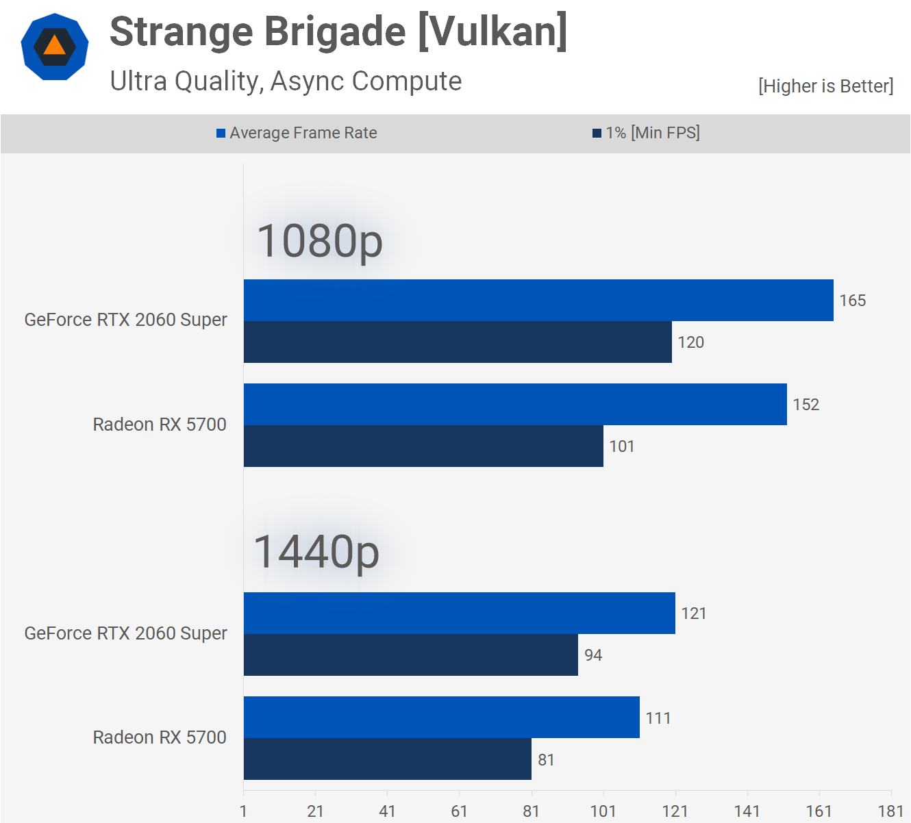 Strange Brigade était un titre qu'AMD avait l'habitude de dominer, mais avec quelques mises à jour de pilotes optimisées, Nvidia a pris l'avantage sur AMD. Dans le cas des modèles 2060 Super et 5700, Nvidia a en fait une longueur d’avance supérieure à celle du processeur graphique Radeon à 350 $ avec une marge de 9%.