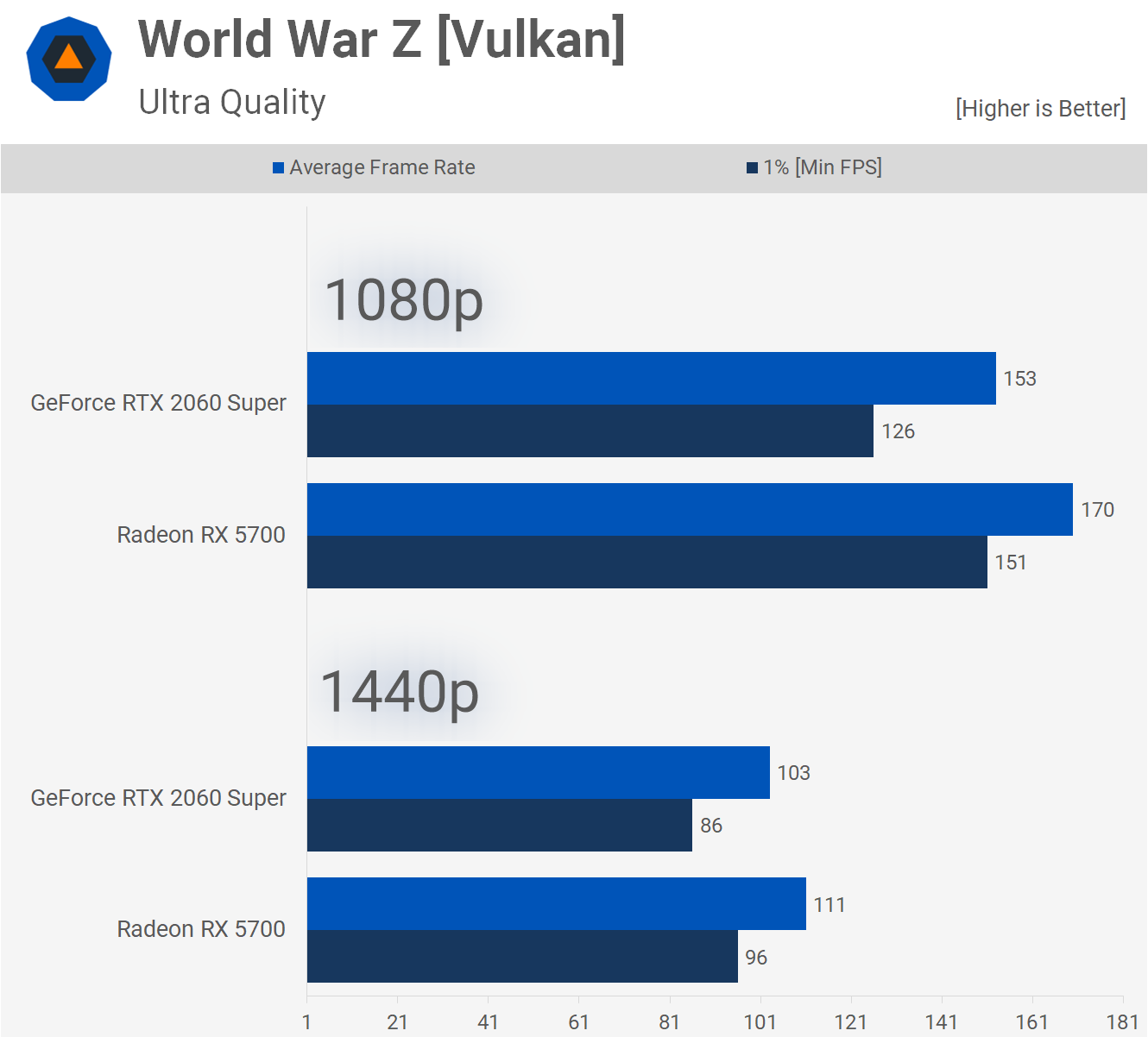 Deux mises à jour de performances ont été mises à jour ces derniers mois par World War Z, mais elles n’ont pas modifié les marges entre les GPU AMD et Nvidia. Le 5700 est toujours 11% plus rapide en moyenne à 1080p et 8% plus rapide à 1440p.