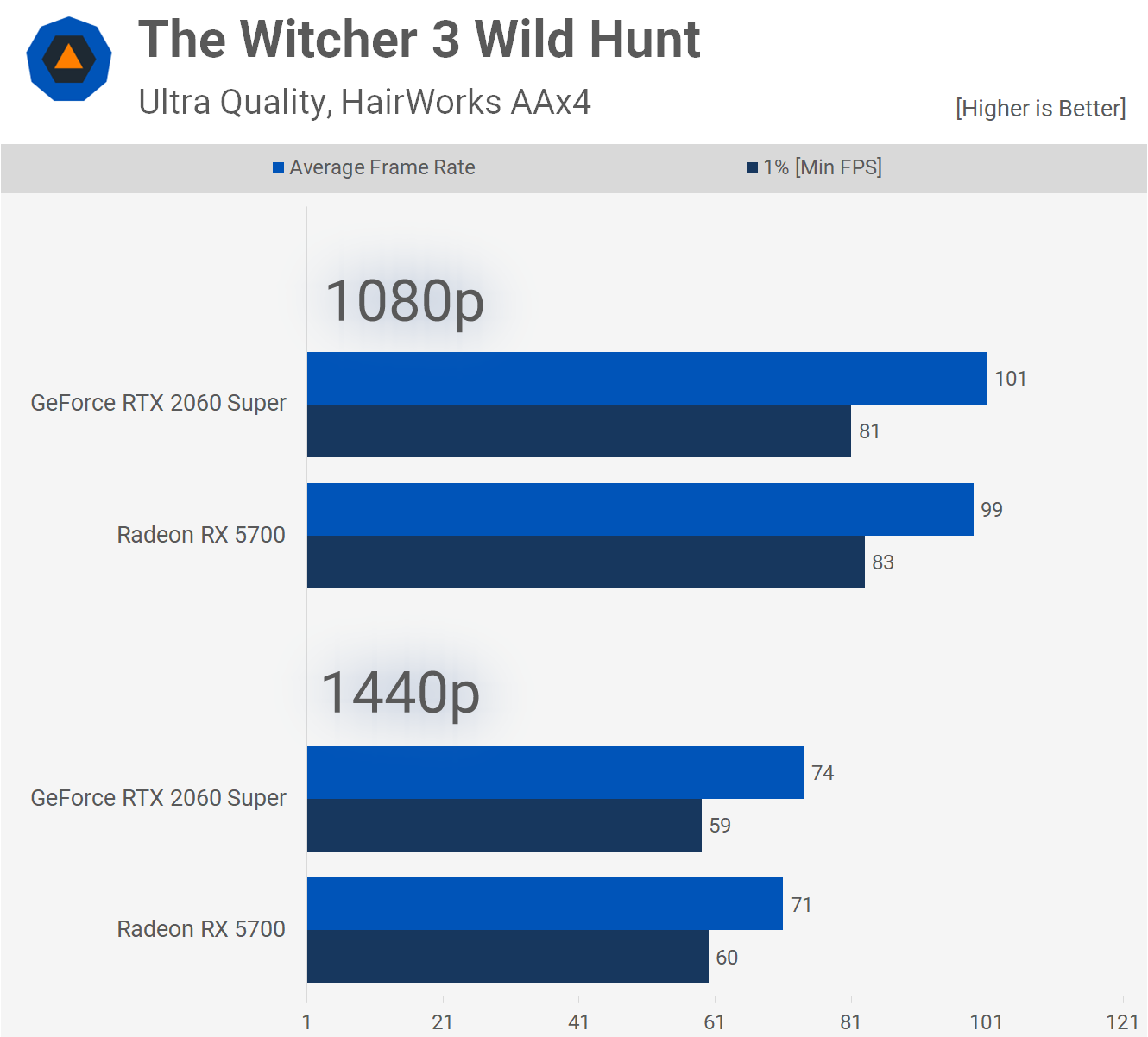 The Witcher 3 Wild Hunt est un autre titre à montrer des résultats très compétitifs, le Super 2060 a été plus rapide de quelques images, mais encore une expérience de jeu identique.