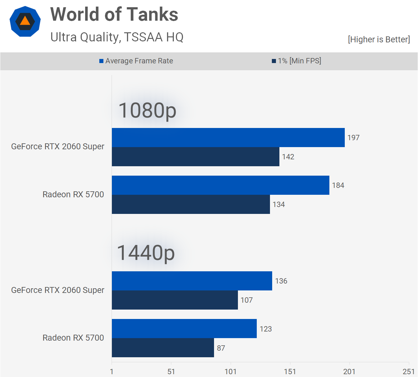 Enfin, nous avons World of Tanks et celui-ci va en faveur de Nvidia puisque le 2060 Super offre 7% de performances en plus en 1080p et 11% de plus en 1440p. Vous ne remarquerez pas la différence à 1080p, mais à 1440p, vous remarquerez peut-être les images supplémentaires de la 2060 Super, qui affichent de bien meilleures performances à 1% par rapport au minimum.