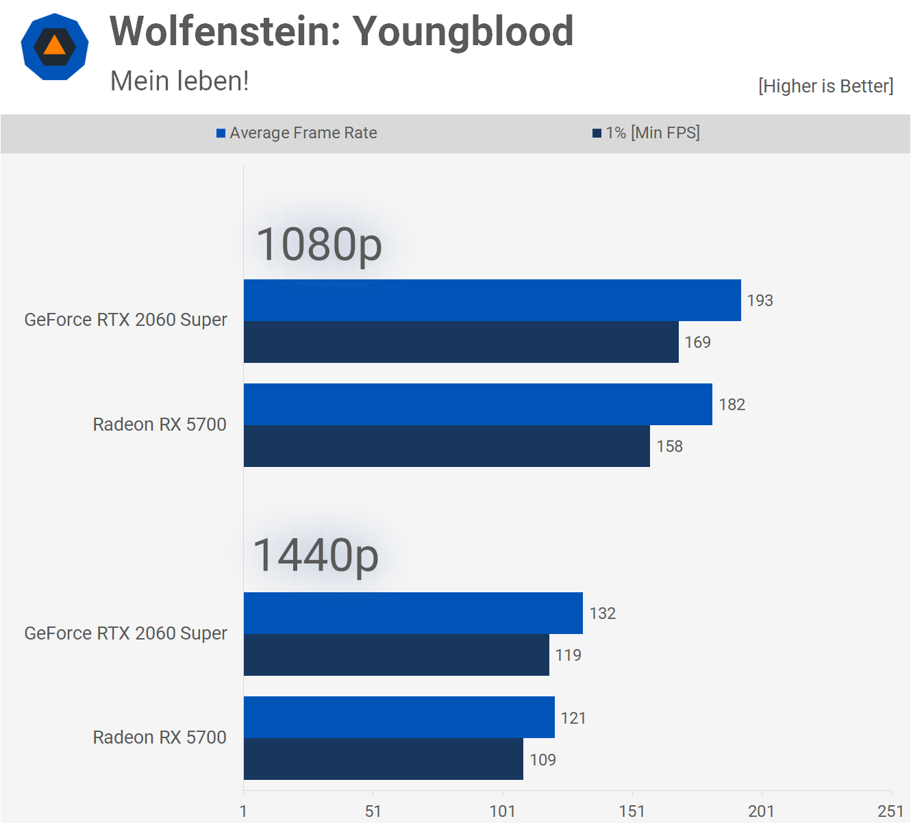 Wolfenstein: Youngblood, le Super 2060, a obtenu 6% de performances supplémentaires en 1080p et 9% de performances supplémentaires en 1440p. La différence n'est pas énorme et les deux GPU ont poussé à plus de 100 fps en tout temps, même à 1440p.