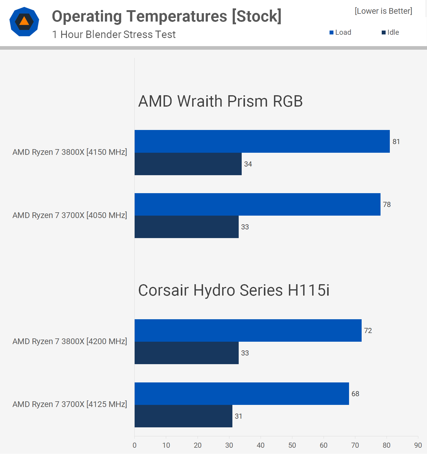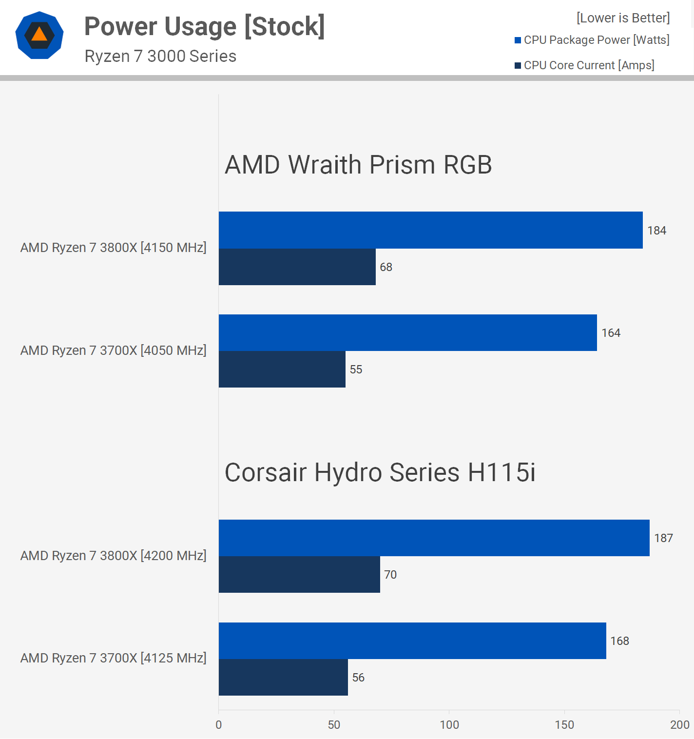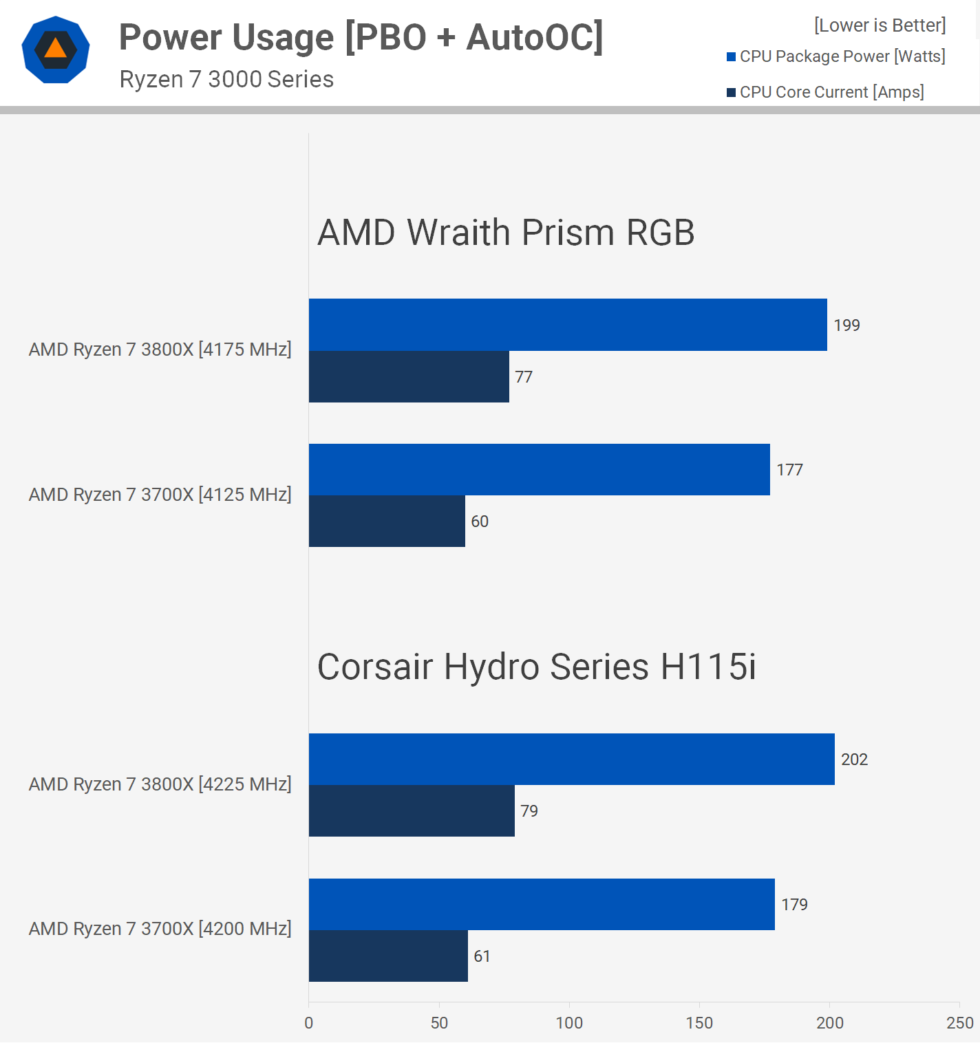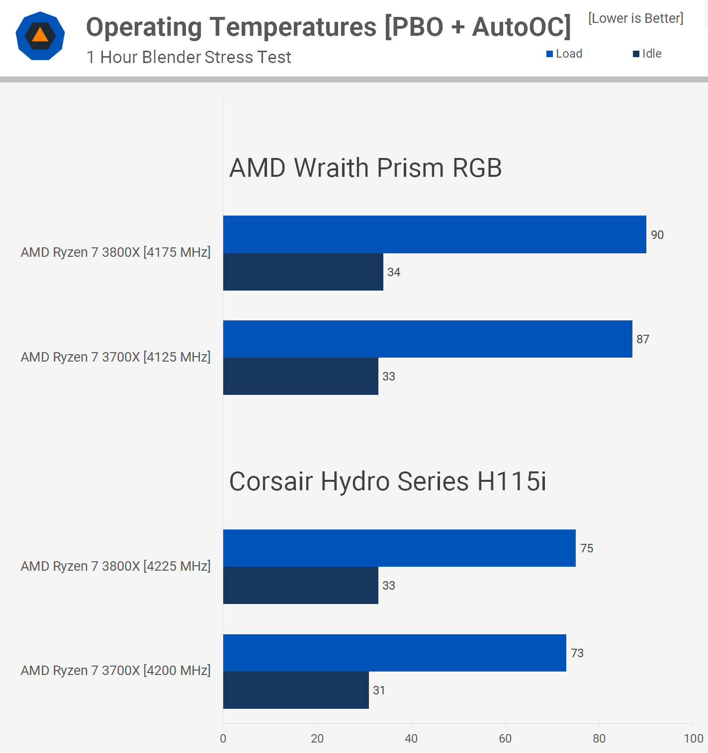 En raison de cette consommation électrique accrue, le 3800X chauffe de 3 degrés avec le refroidisseur de boîte et de 4 degrés avec le Corsair H115i Pro. Fait intéressant, avec le refroidisseur de boîte, le 3800X a une cadence supérieure de 100 MHz, mais seulement de 75 MHz avec le Corsair AIO.