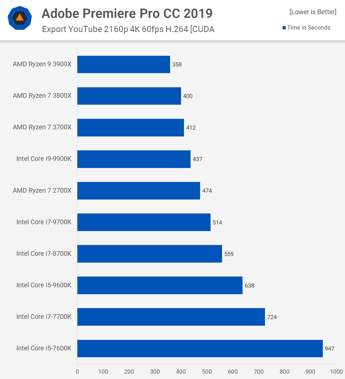 Le temps d’encodage dans Premiere est réduit de 3%, ce qui réduit de 12 secondes notre test. Étant donné ce que nous avons vu dans Cinebench R20, ce résultat n’est pas surprenant.