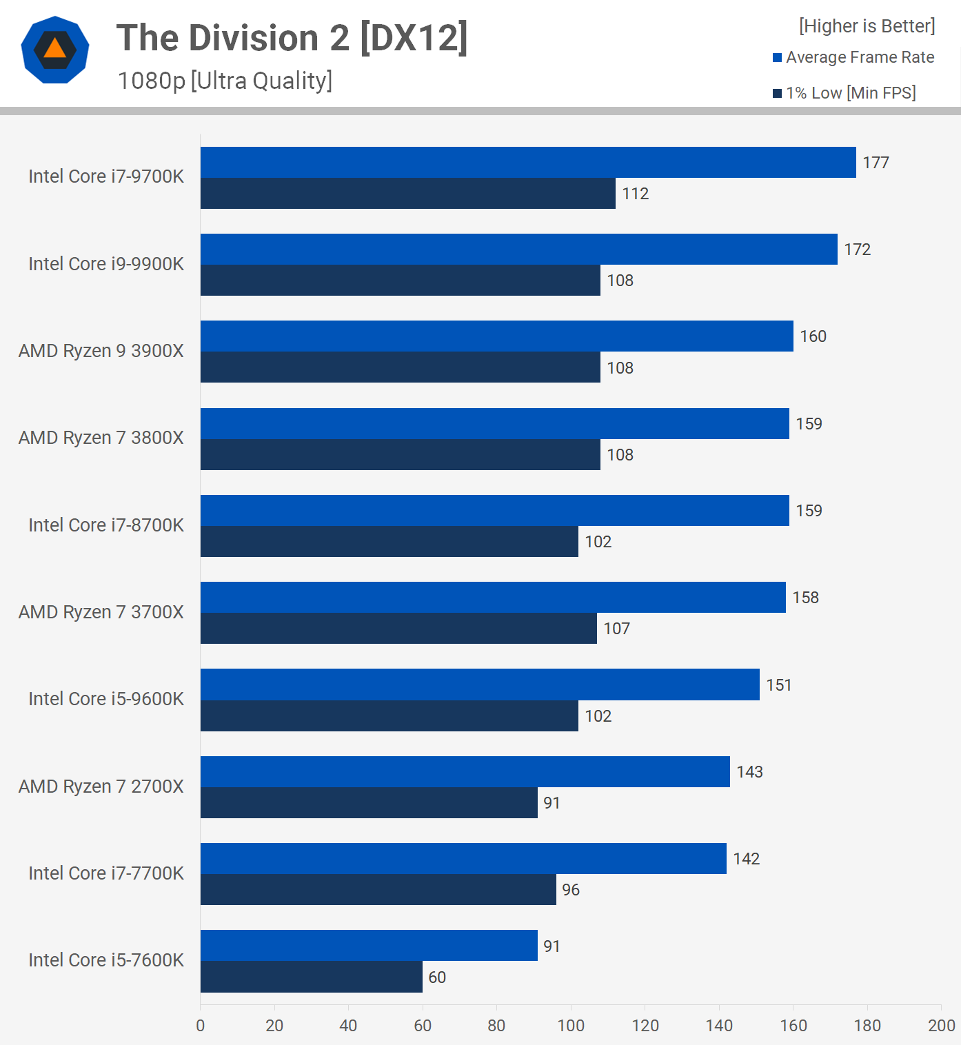Des performances pratiquement identiques sont également constatées lors des tests avec The Division 2. Nous envisageons des performances similaires aux Core i7-8700K dans ce titre.