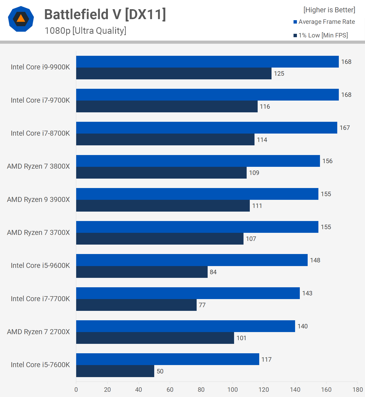 La même chose s’observe lors des tests avec Battlefield V: le 3800X est 1-2fps plus rapide que le 3700X, grâce à une très faible augmentation de la fréquence d’opération. Encore une fois, vous ne remarquerez jamais cette différence de performances.