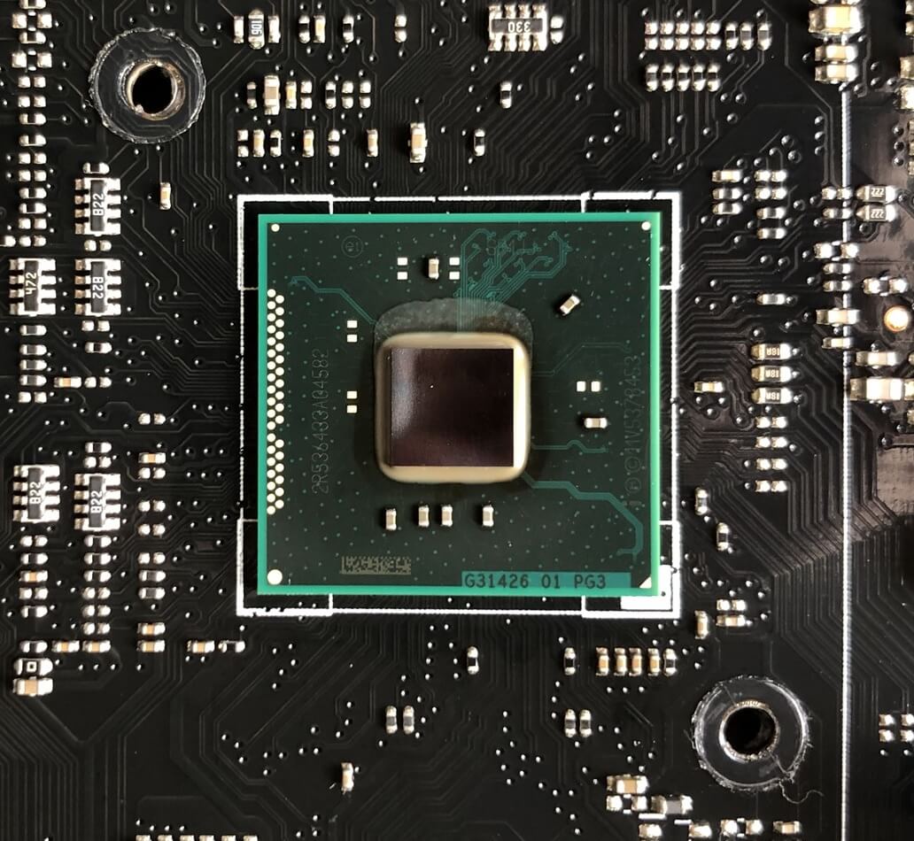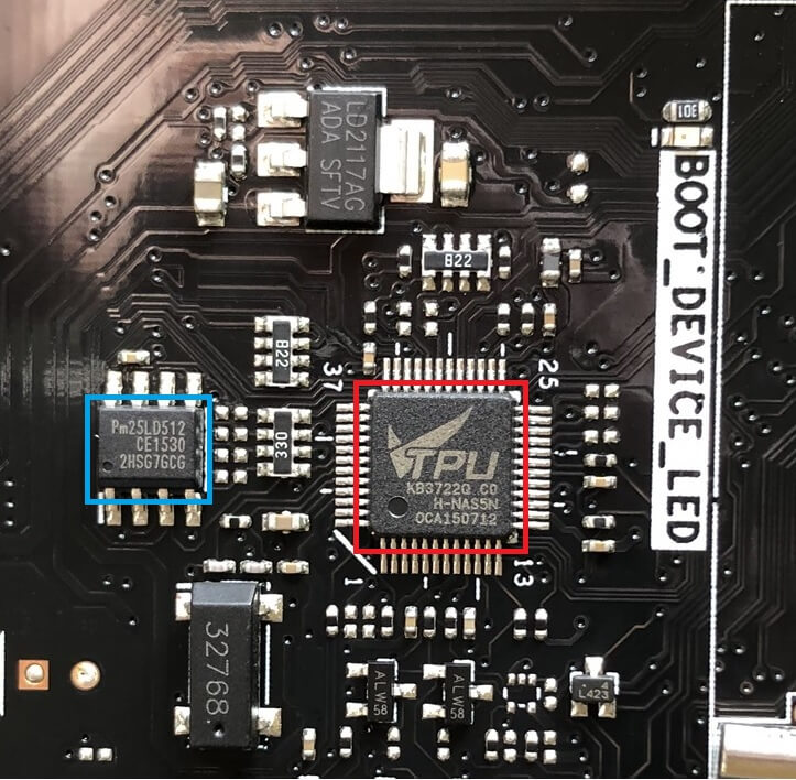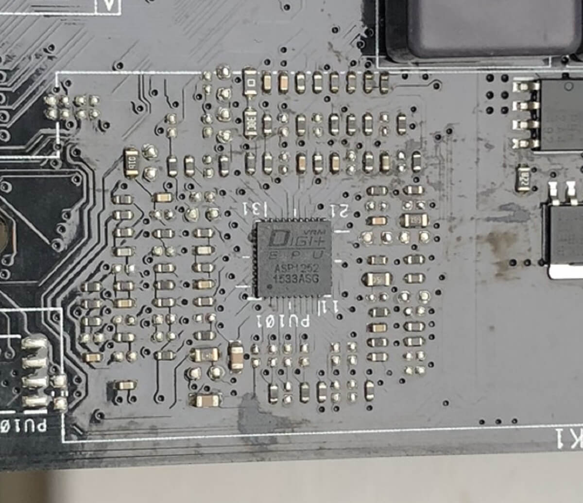 Le petit appareil Pm25LD512 à côté, surligné en bleu, est une puce de mémoire flash qui stocke les paramètres d’horloge et de tension lorsque la carte mère est éteinte, vous n’avez donc pas à les refaire à chaque mise sous tension du PC.