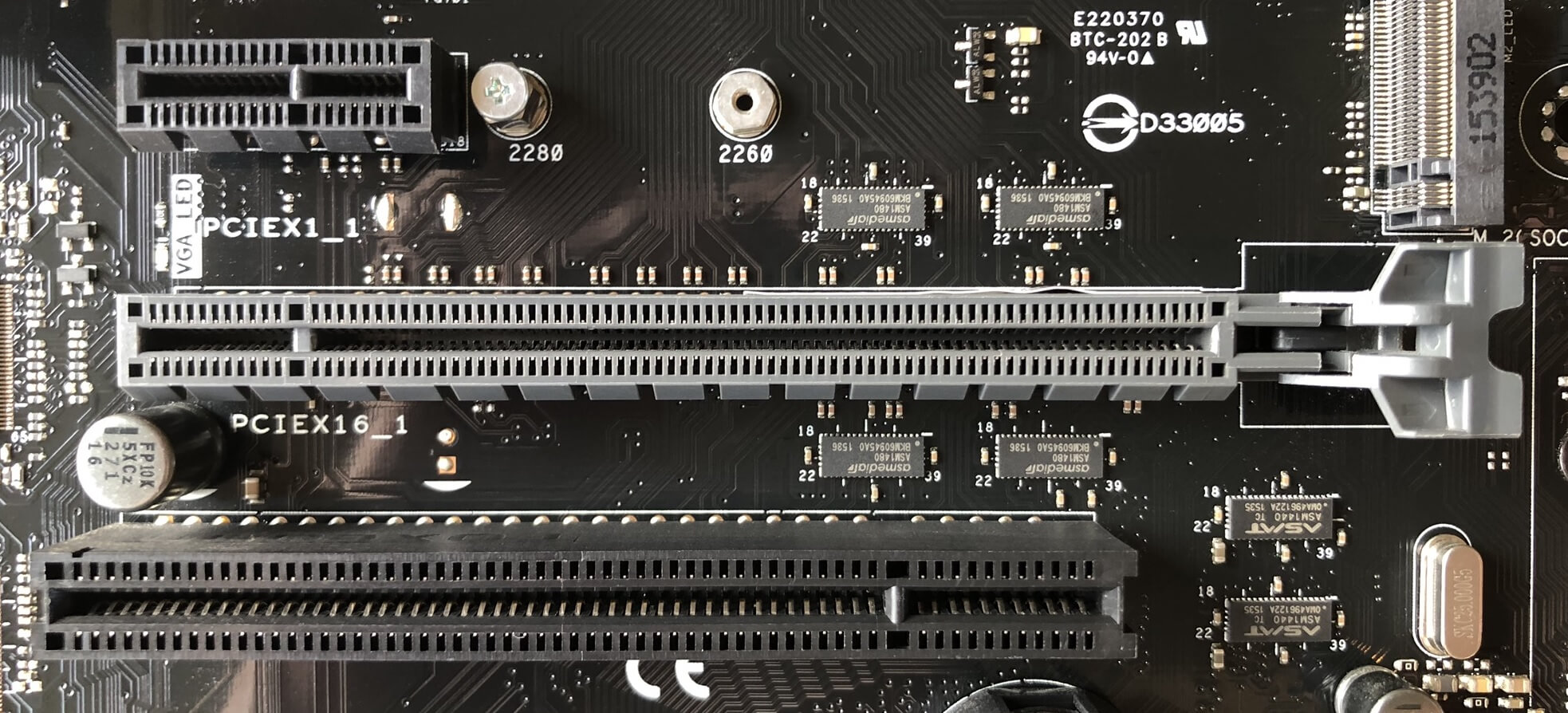 L’image ci-dessous montre 3 sockets: les deux premiers sont PCI Express, tandis que celui du bas est un système beaucoup plus ancien appelé PCI (lié à PCIe, mais un lot Ralentissez). Le petit en haut est étiqueté PCIEX1_1 car il s’agit d’une prise à voie unique; celui ci-dessous est une prise à 16 voies.