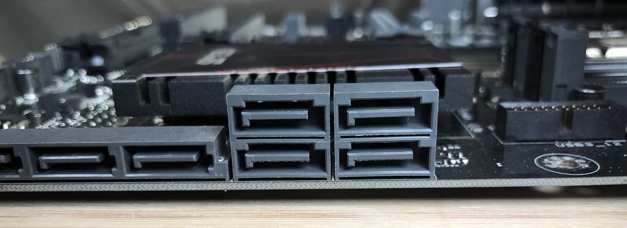 Dans le cas de notre carte mère Asus, les ports SATA (utilisés pour connecter des disques durs, des graveurs de DVD, etc.) sont regroupés comme indiqué ci-dessus en raison de cette limitation. Le bloc de 4 ports au milieu utilise les connexions USB standard du chipset, tandis que les deux à gauche utilisent certaines de ces connexions à haute vitesse.